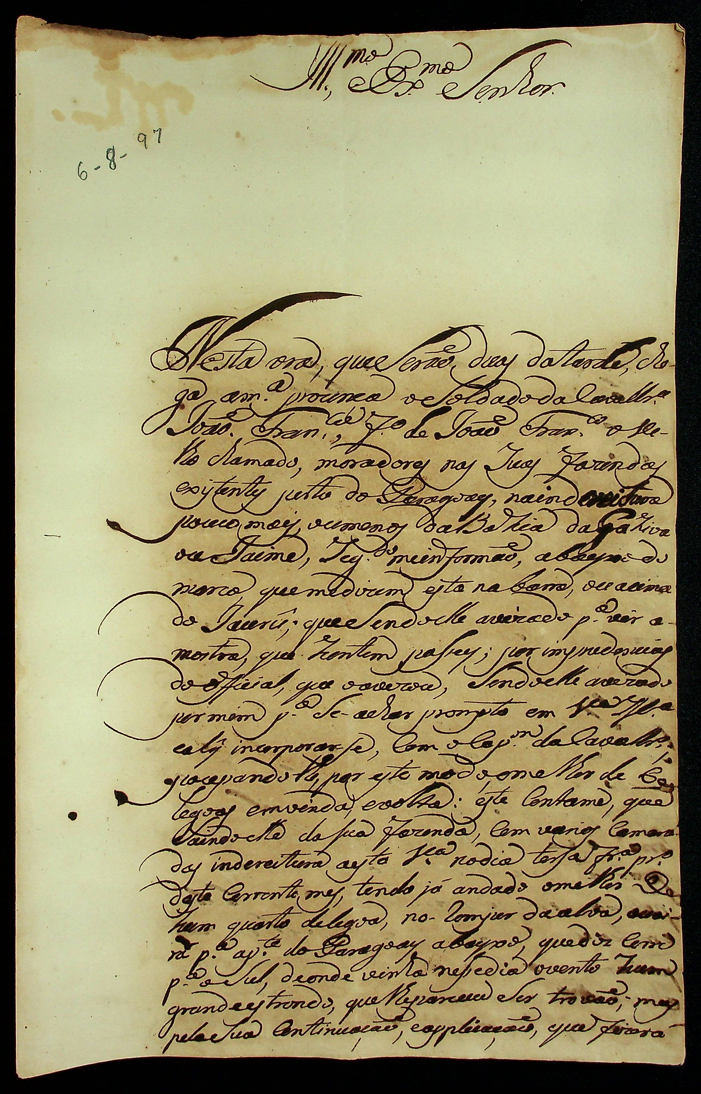 CARTA do Mestre de Campo José Paes Falcão das Neves ao [Governador e Capitão-General da Capitania de Mato Grosso] Caetano Pinto de Miranda e Montenegro.