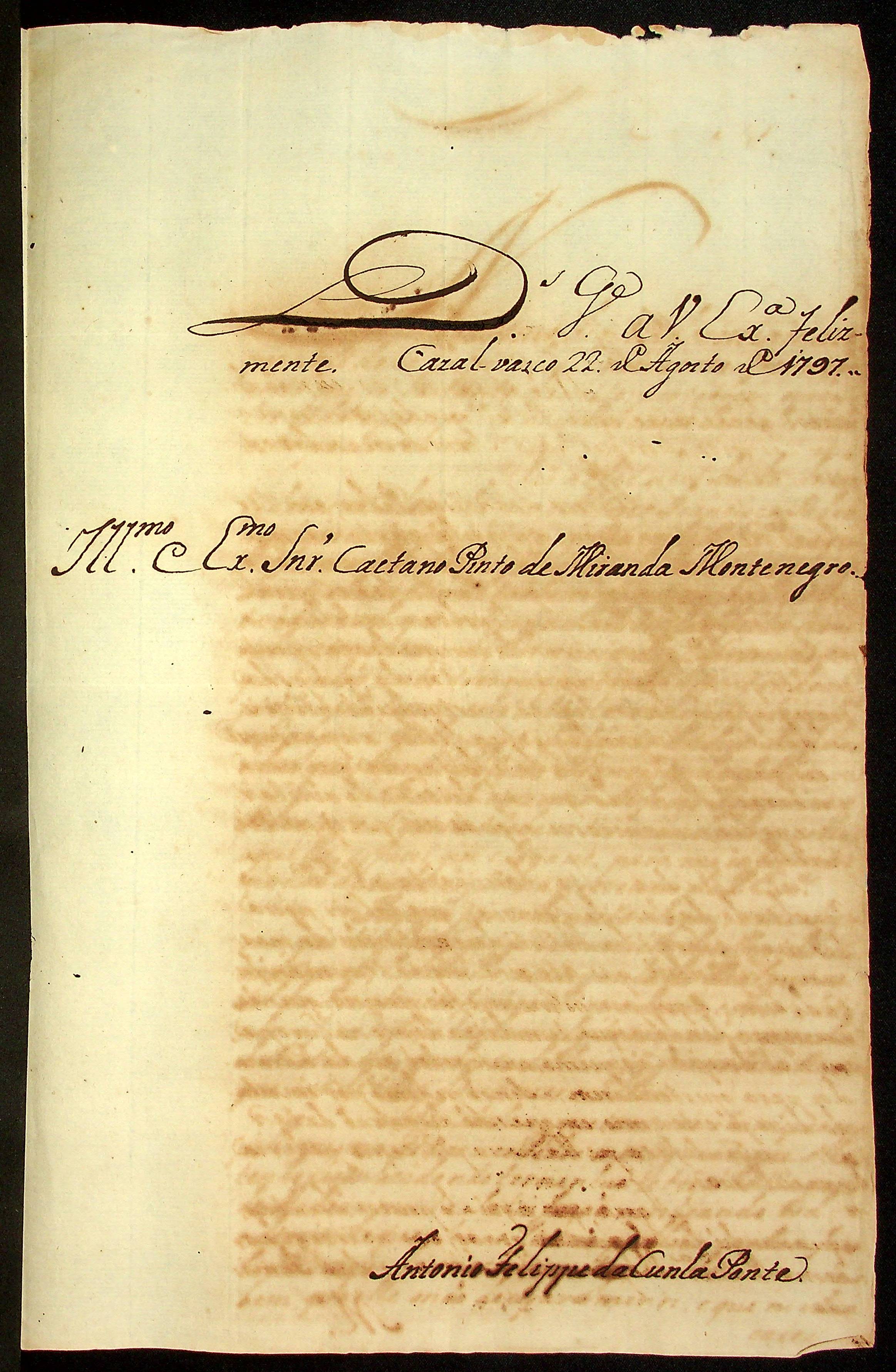CARTA do [Tenente-Coronel] Antônio Felipe da Cunha Ponte ao [Governador e Capitão-General da Capitania de Mato Grosso] Caetano Pinto de Miranda e Montenegro.