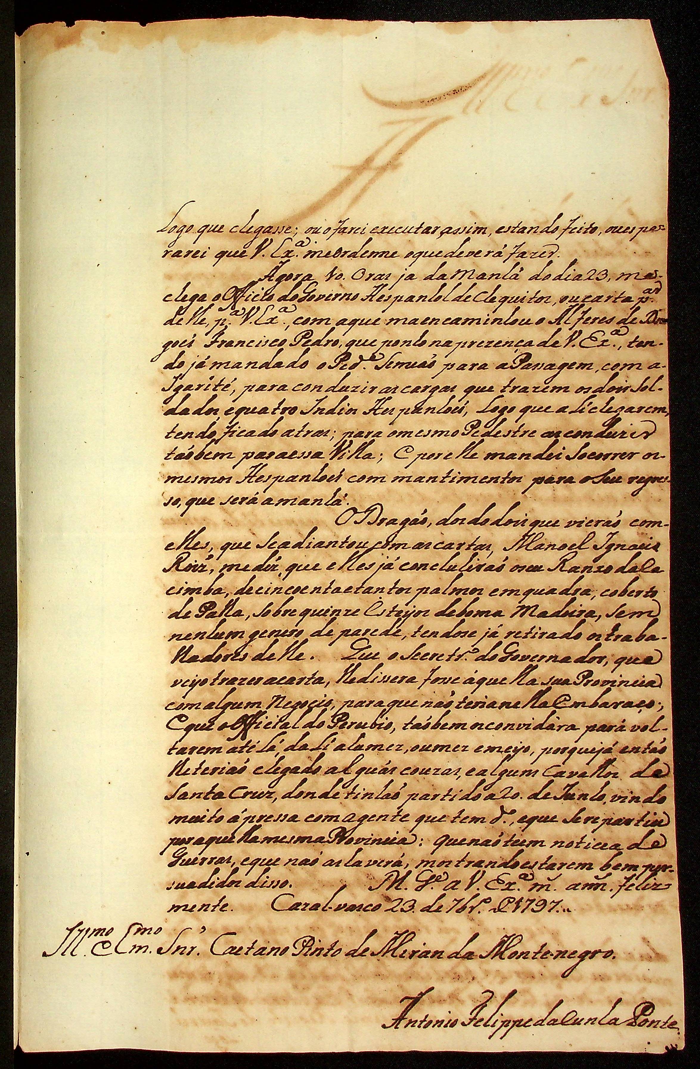 CARTA do [Tenente-Coronel] Antônio Felipe da Cunha Ponte ao [Governador e Capitão-General da Capitania de Mato Grosso] Caetano Pinto de Miranda e Montenegro.