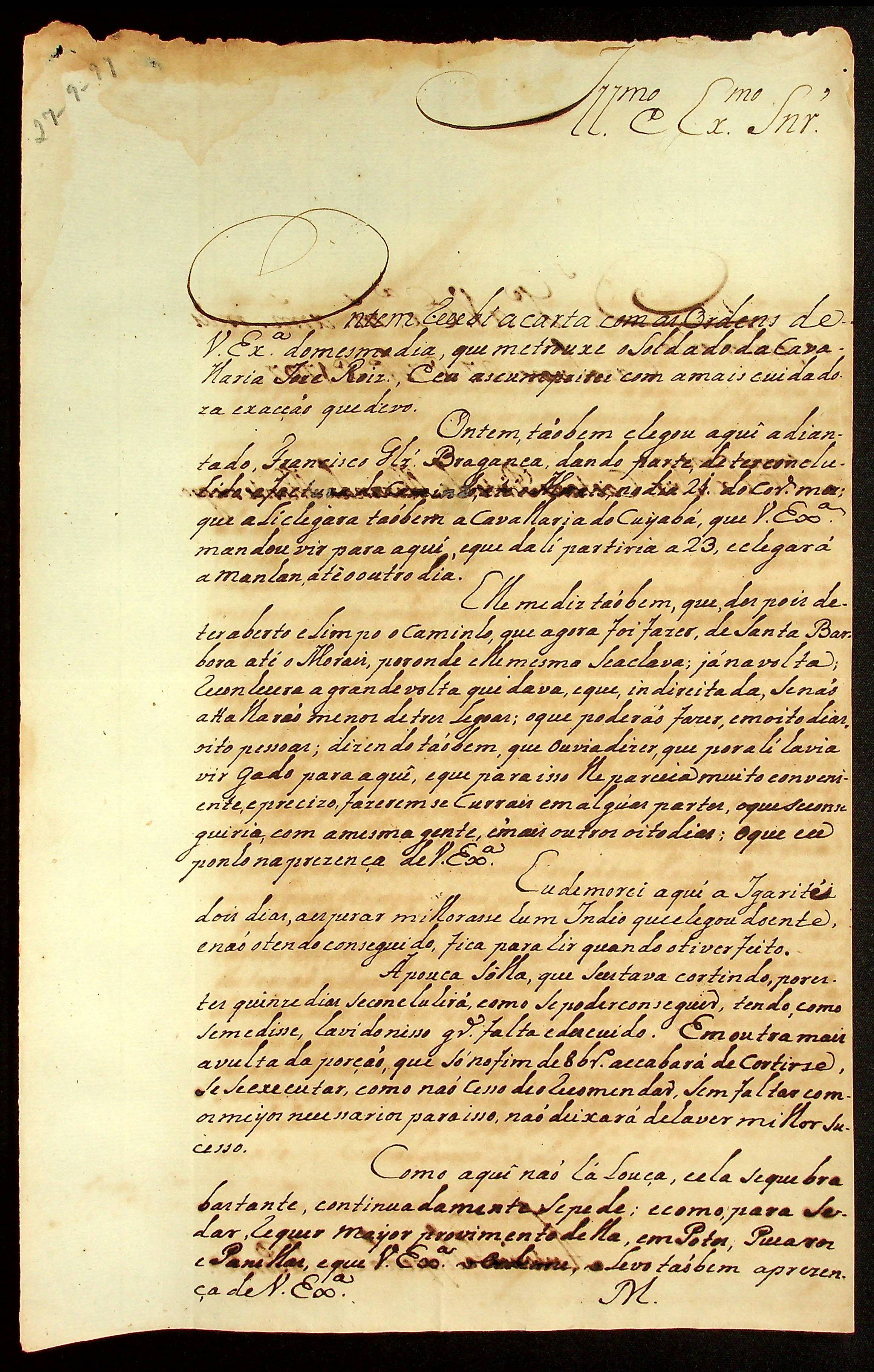 CARTA do [Tenente-Coronel] Antônio Felipe da Cunha Ponte ao [Governador e Capitão-General da Capitania de Mato Grosso] Caetano Pinto de Miranda e Montenegro.