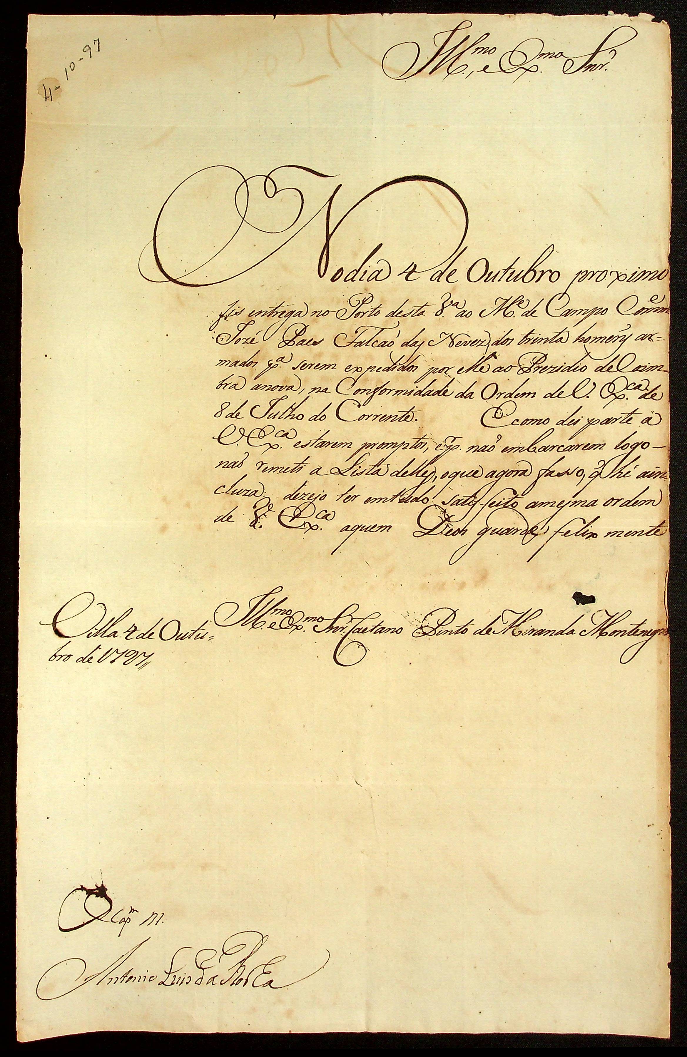 CARTA do Capitão-mor Antônio Luiz da Rocha ao [Governador e Capitão-General da Capitania de Mato Grosso] Caetano Pinto de Miranda e Montenegro.