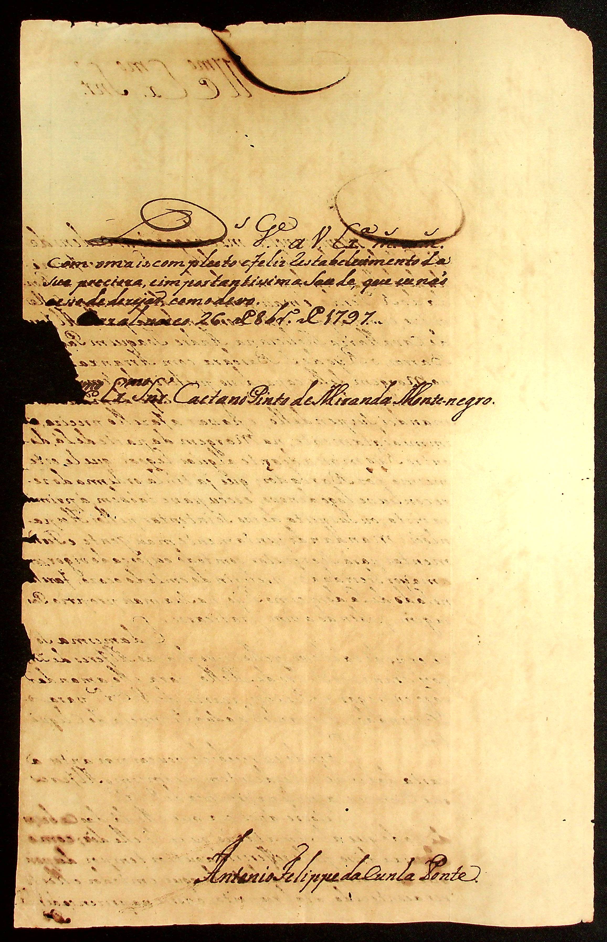 CARTA do [Tenente-Coronel] Antônio Felipe da Cunha Ponte ao [Governador e Capitão-General da Capitania de Mato Grosso] Caetano Pinto de Miranda e Montenegro.