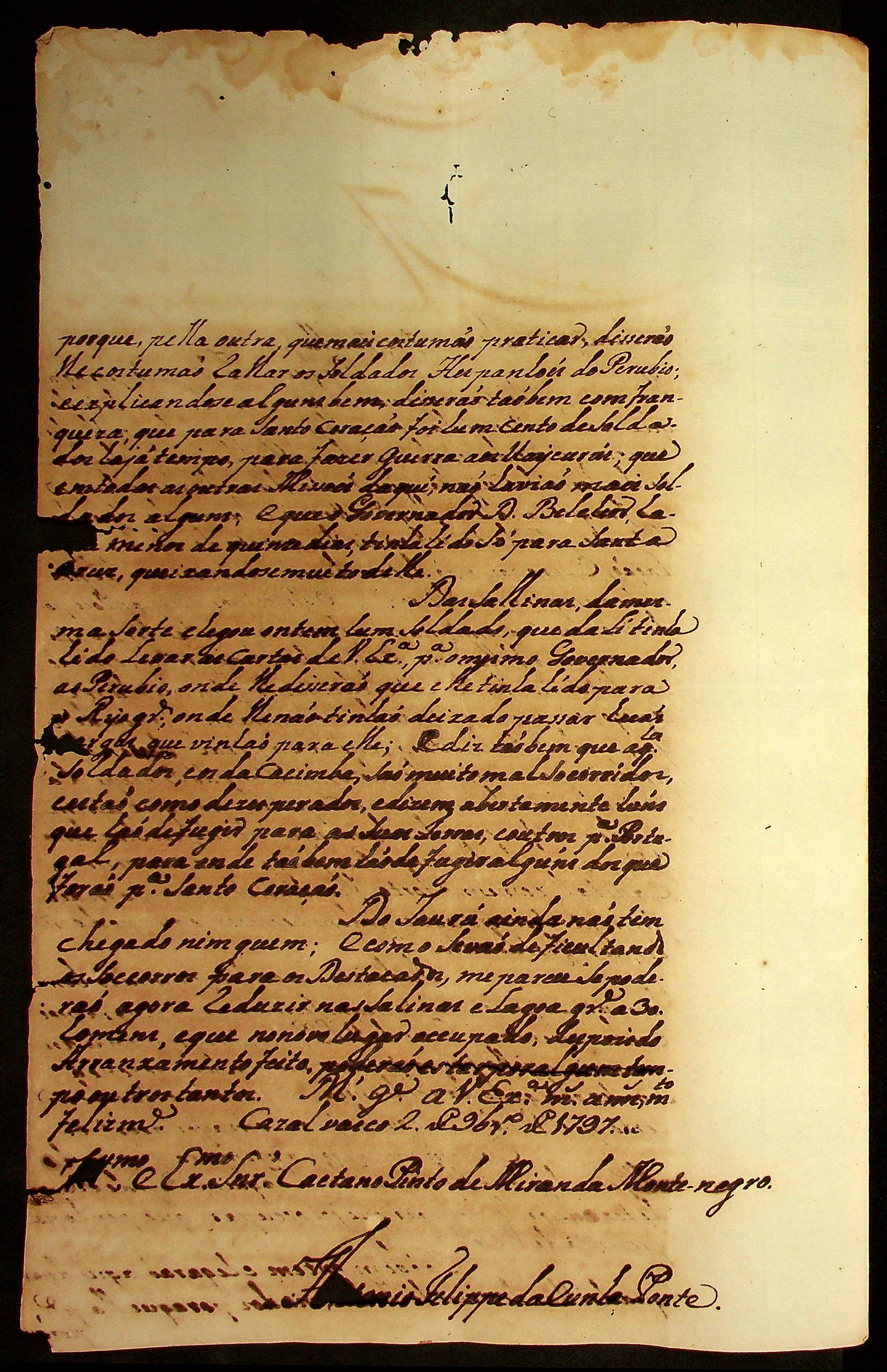 CARTA do [Tenente-Coronel] Antônio Felipe da Cunha Ponte ao [Governador e Capitão-General da Capitania de Mato Grosso] Caetano Pinto de Miranda e Montenegro.