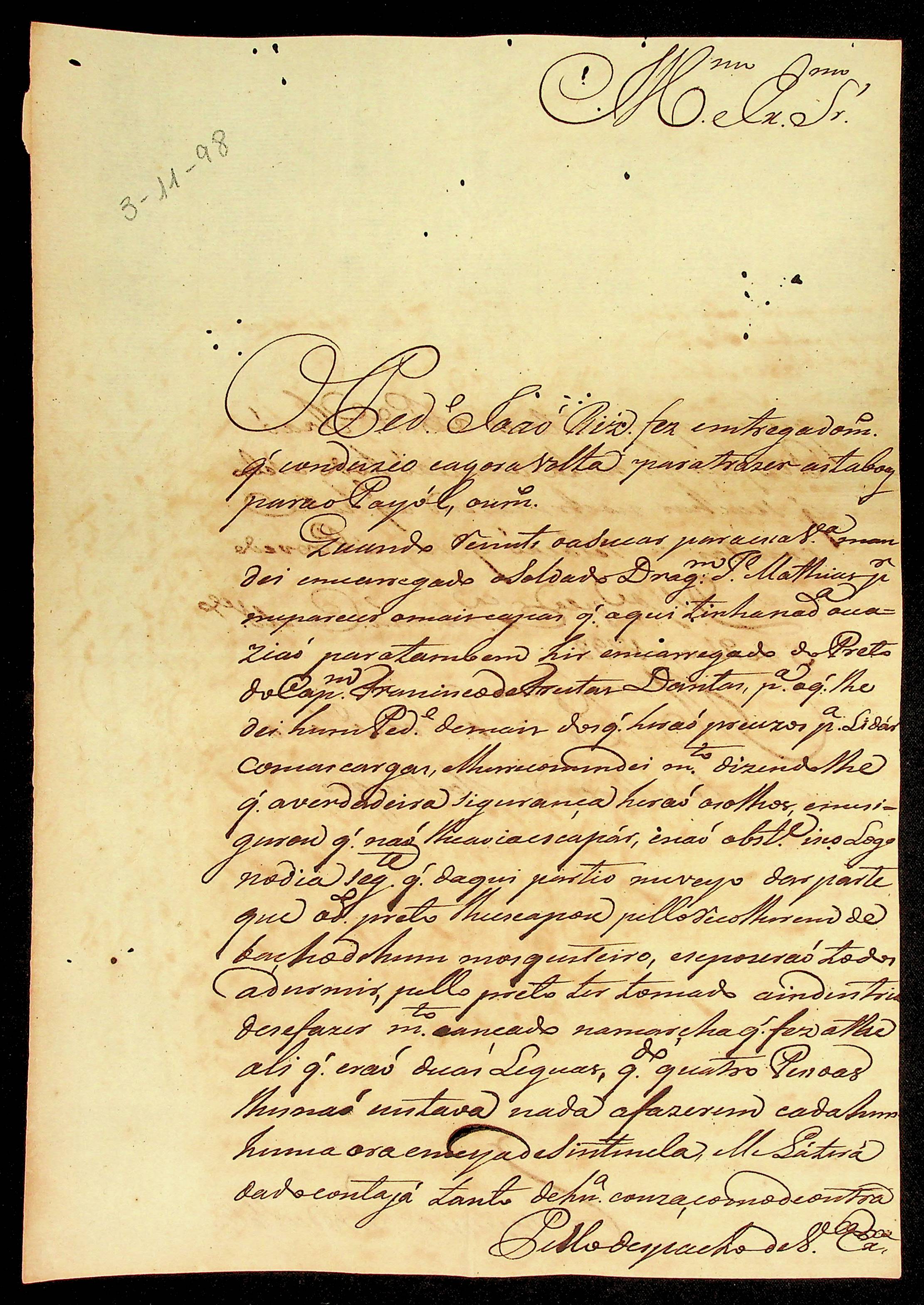 CARTA do [Alferes de Cavalaria] Francisco Pedro de Melo ao [Governador e Capitão-General da Capitania de Mato Grosso] Caetano Pinto de Miranda e Montenegro.