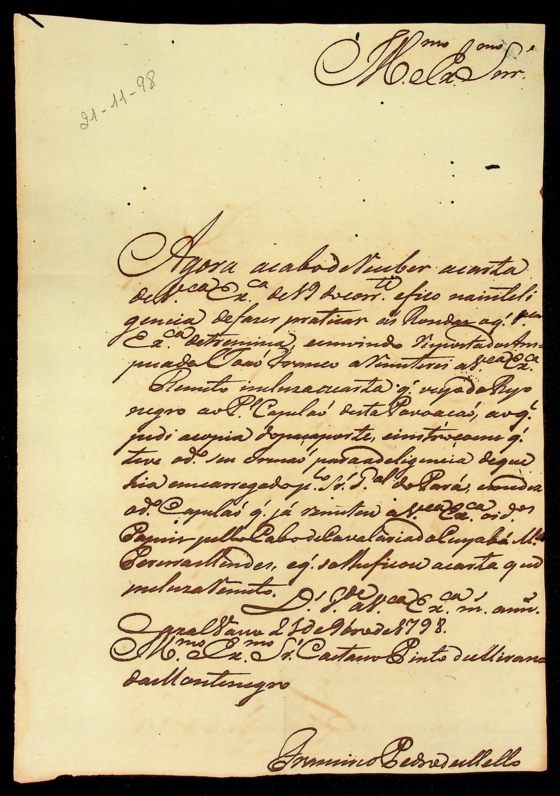 CARTA do [Alferes de Dragão] Francisco Pedro de Melo ao Governador e [Capitão-General da Capitania de Mato Grosso] Caetano Pinto de Miranda e Montenegro.