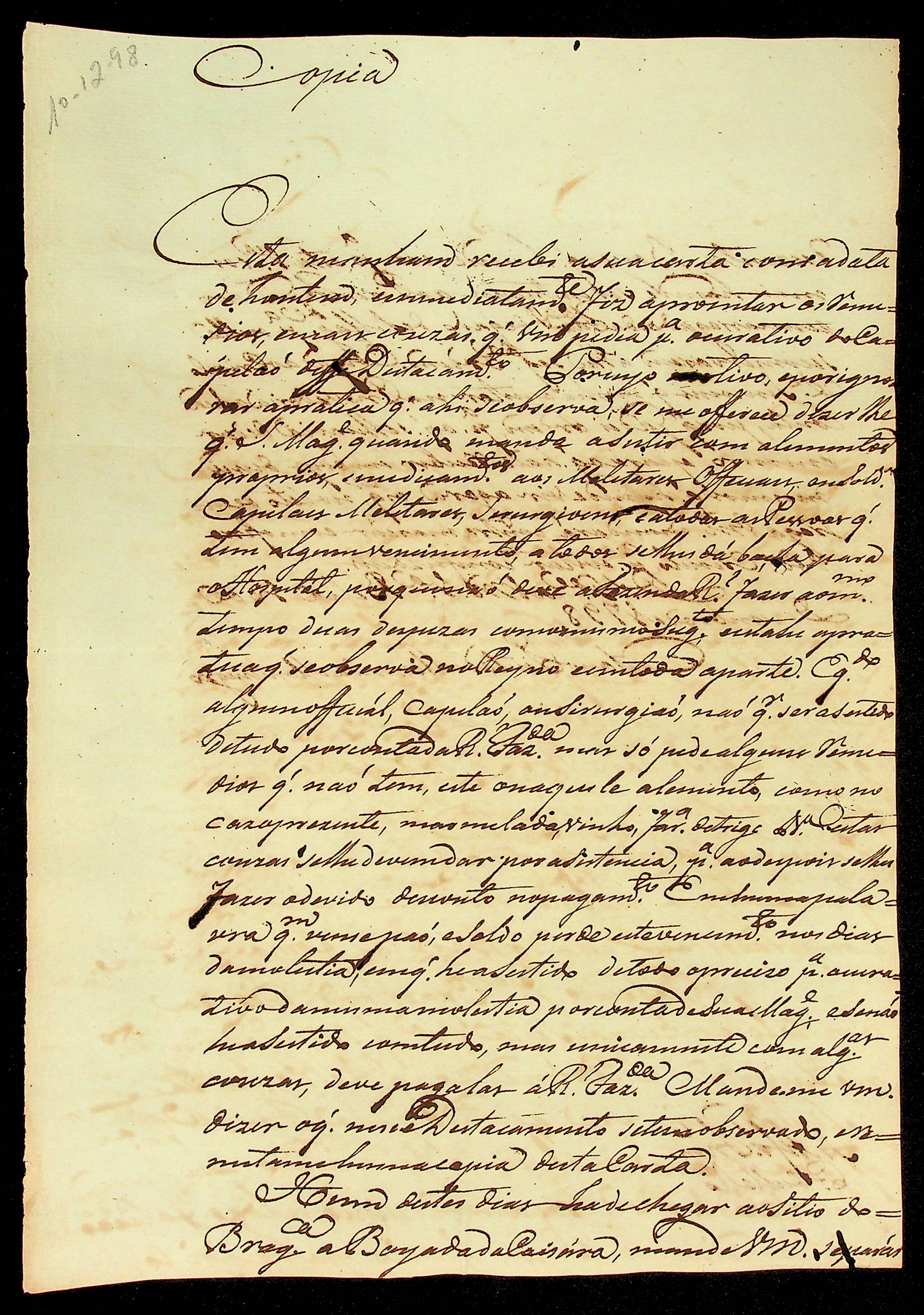 CARTA (cópia) do [Alferes de Dragão] Francisco Pedro de Melo ao [Governador e Capitão-General da Capitania de Mato Grosso] Caetano Pinto de Miranda e Montenegro.