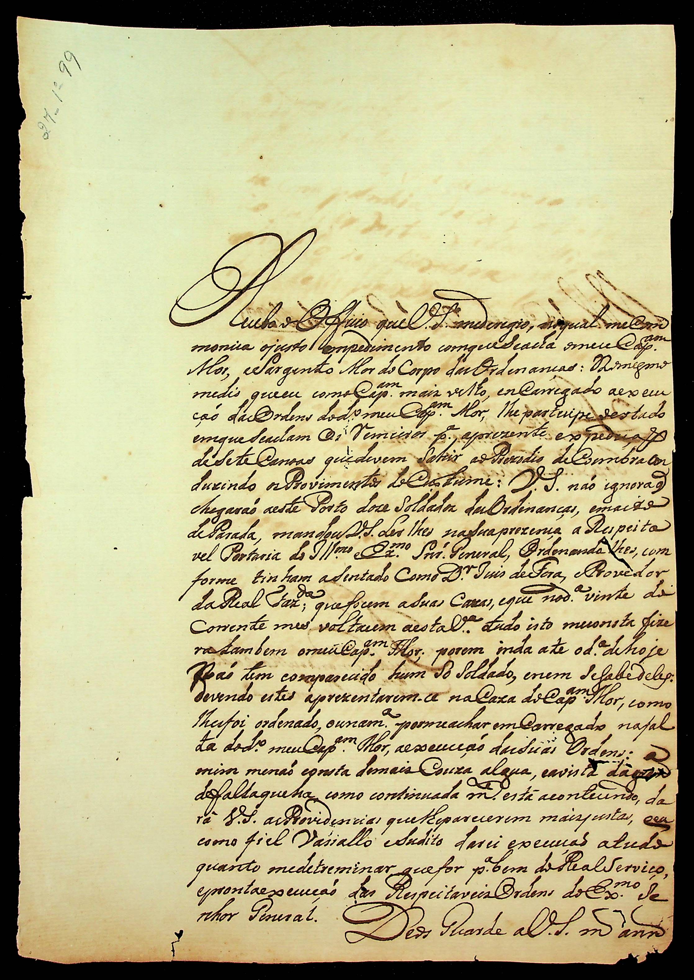 CARTA do Capitão das Ordenanças Paulo Fernando Machado ao Mestre de Campo José Paes Falcão das Neves.