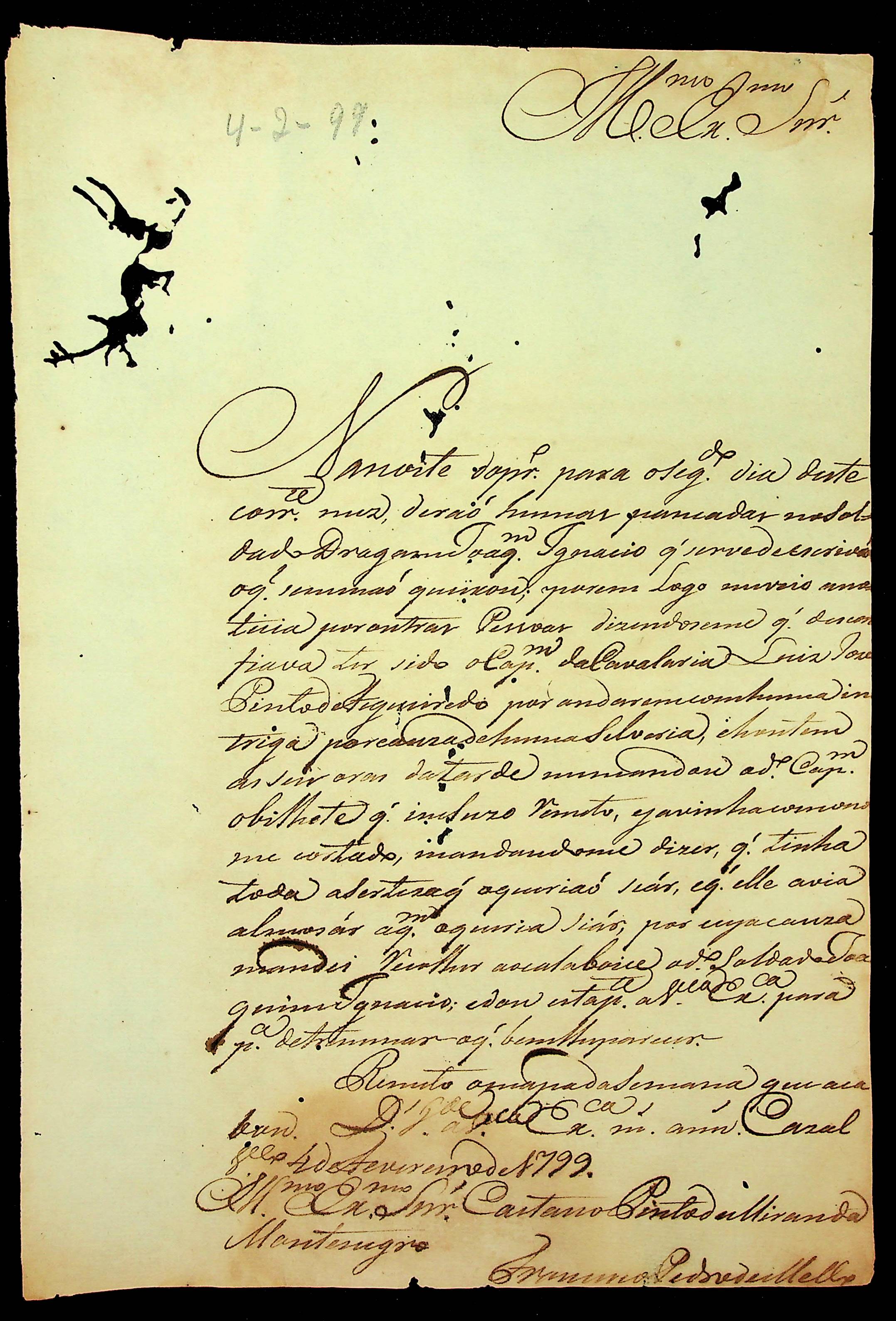 CARTA do [Comandante] Francisco Pedro de Melo ao [Governador e Capitão-General da Capitania de Mato Grosso] Caetano Pinto de Miranda e Montenegro.