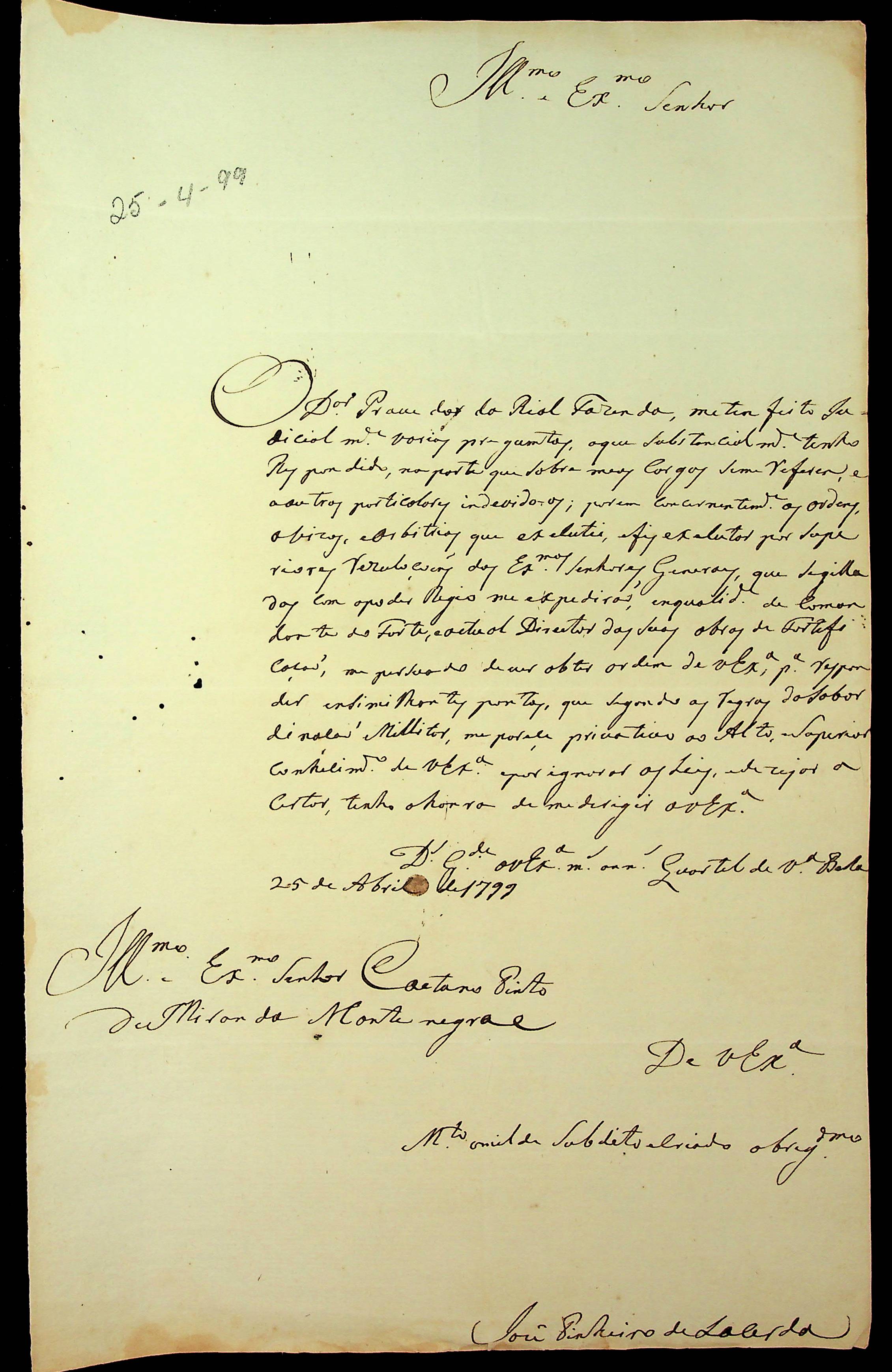 CARTA de José Pinheiro de Lacerda ao [Governador e Capitão-General da Capitania de Mato Grosso] Caetano Pinto de Miranda e Montenegro.