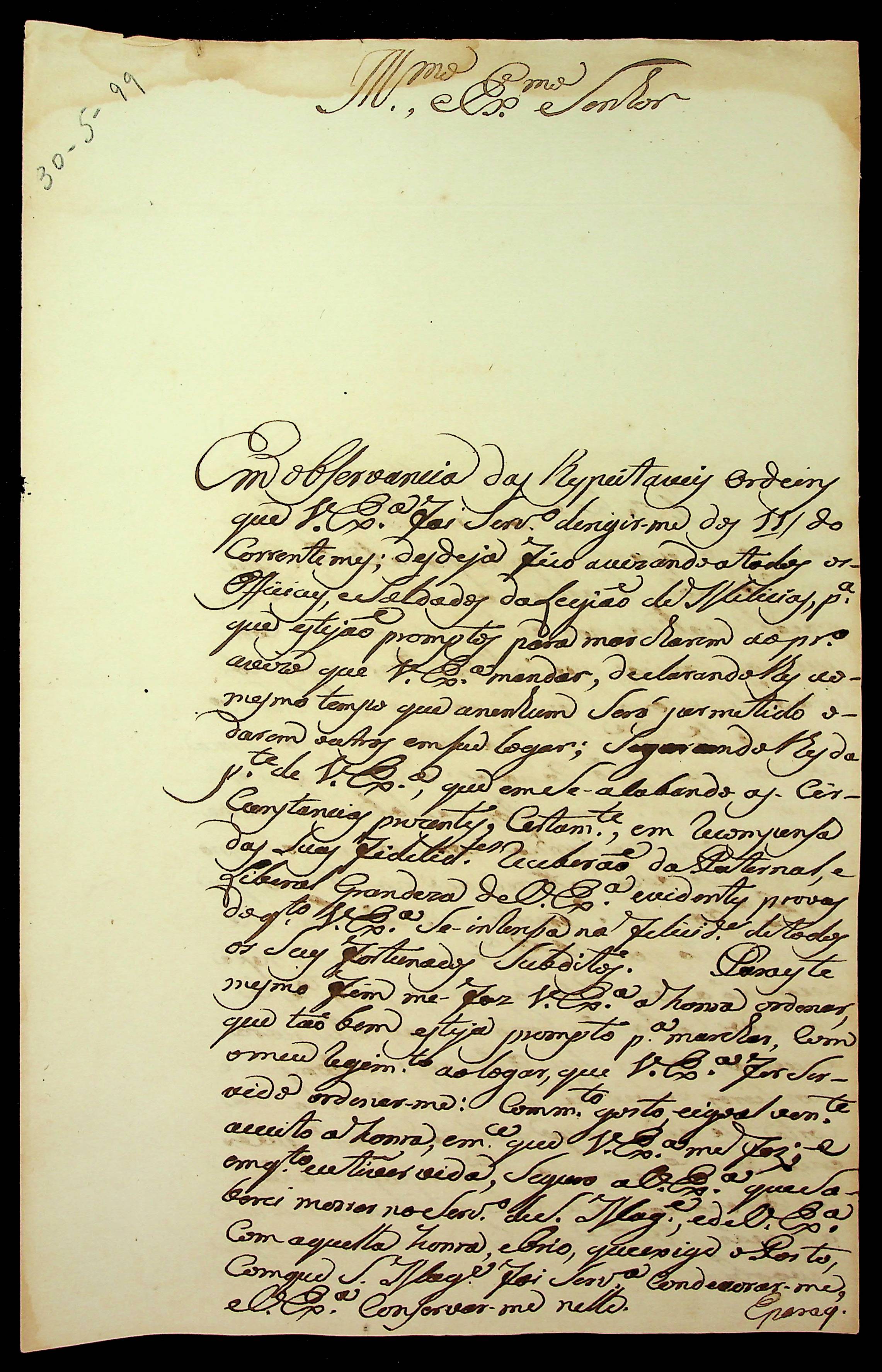CARTA do Mestre de Campo e Comandante José Paes Falcão das Neves ao [Governador e Capitão-General da Capitania de Mato Grosso] Caetano Pinto de Miranda e Montenegro.