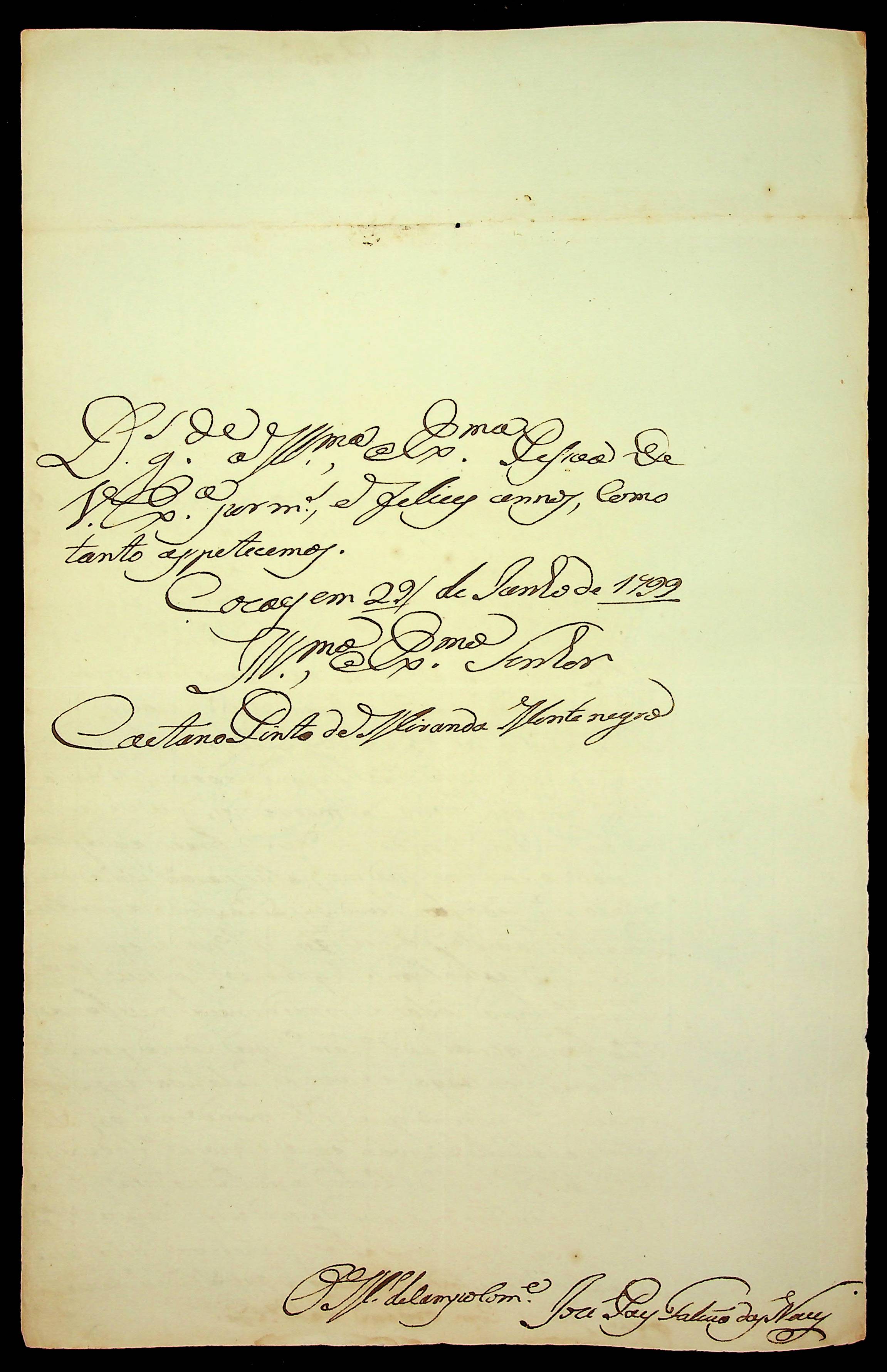 CARTA do Mestre de Campo e Comandante José Paes Falcão das Neves ao [Governador e Capitão-General da Capitania de Mato Grosso] Caetano Pinto de Miranda e Montenegro.
