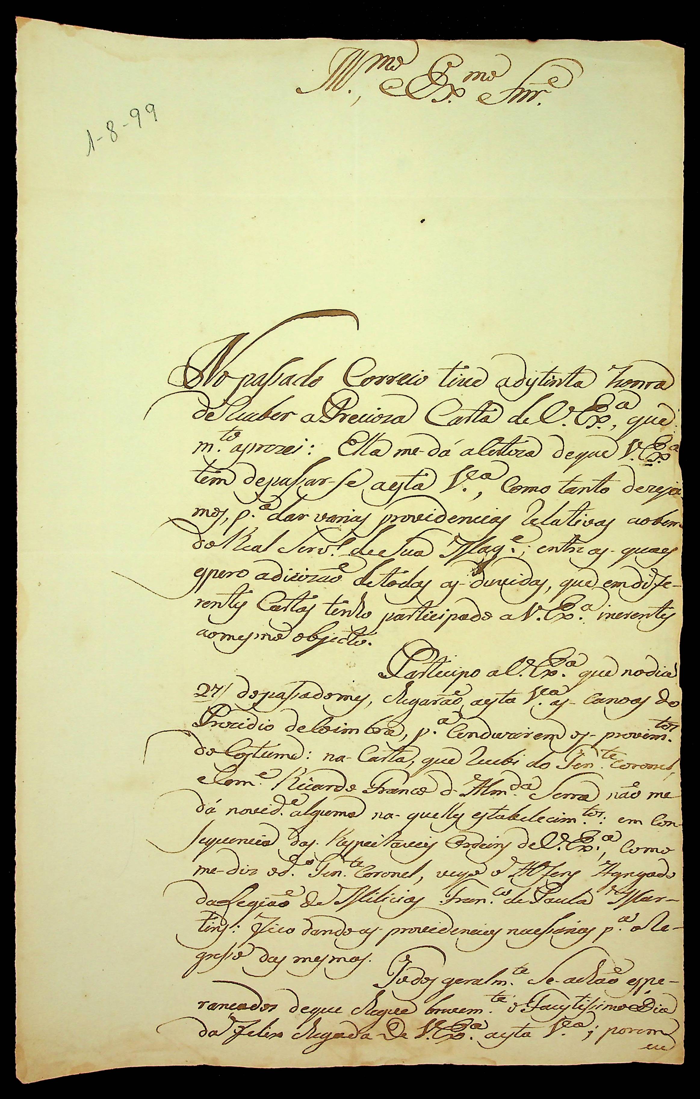 CARTA do Mestre de Campo e Comandante José Paes Falcão das Neves ao [Governador e Capitão-General da Capitania de Mato Grosso] Caetano Pinto de Miranda e Montenegro.