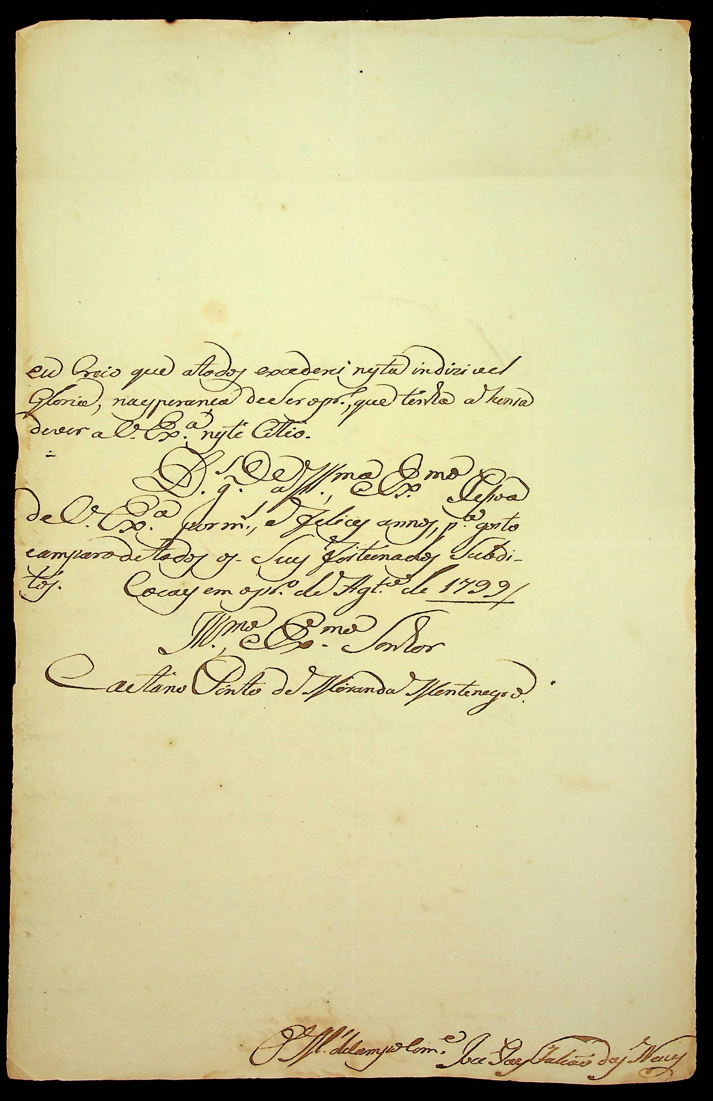 CARTA do Mestre de Campo e Comandante José Paes Falcão das Neves ao [Governador e Capitão-General da Capitania de Mato Grosso] Caetano Pinto de Miranda e Montenegro.