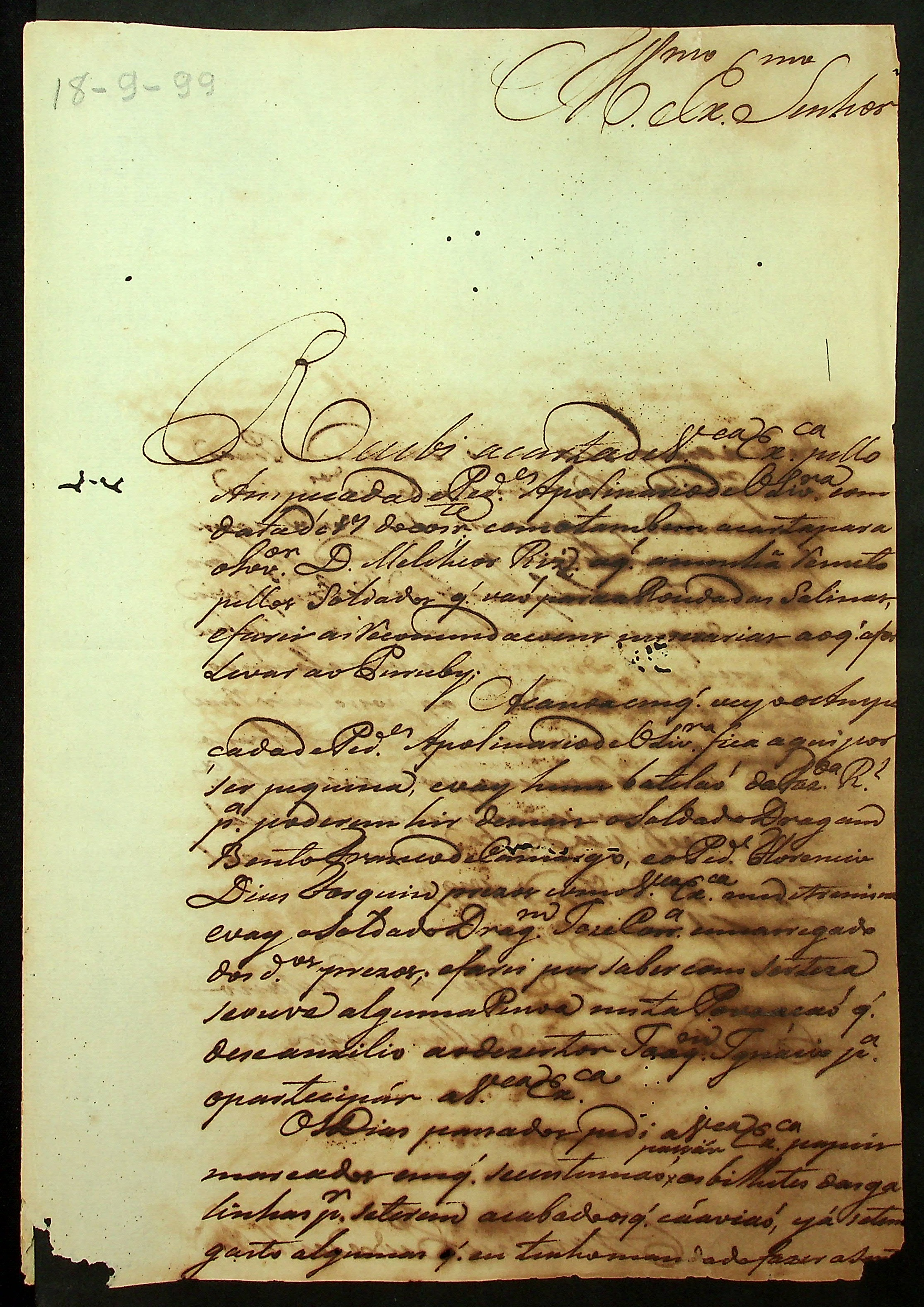 CARTA do [Alferes de Dragões e Comandante] Francisco Pedro de Melo ao [Governador e Capitão-General da Capitania de Mato Grosso] Caetano Pinto de Miranda e Montenegro.