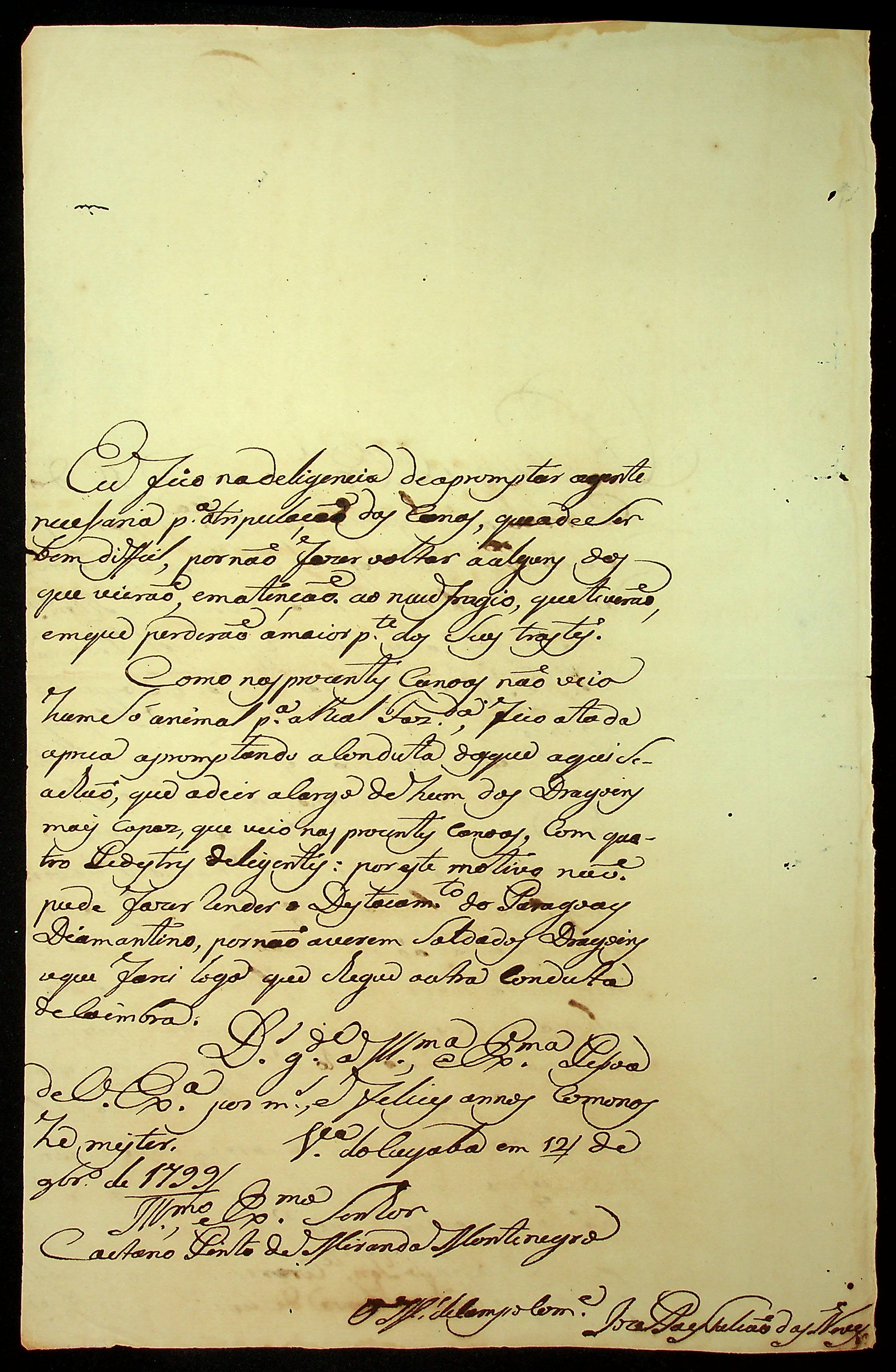 CARTA do [Mestre de Campo] José Paes Falcão das Neves ao [Governador e Capitão-General da Capitania de Mato Grosso] Caetano Pinto de Miranda e Montenegro.