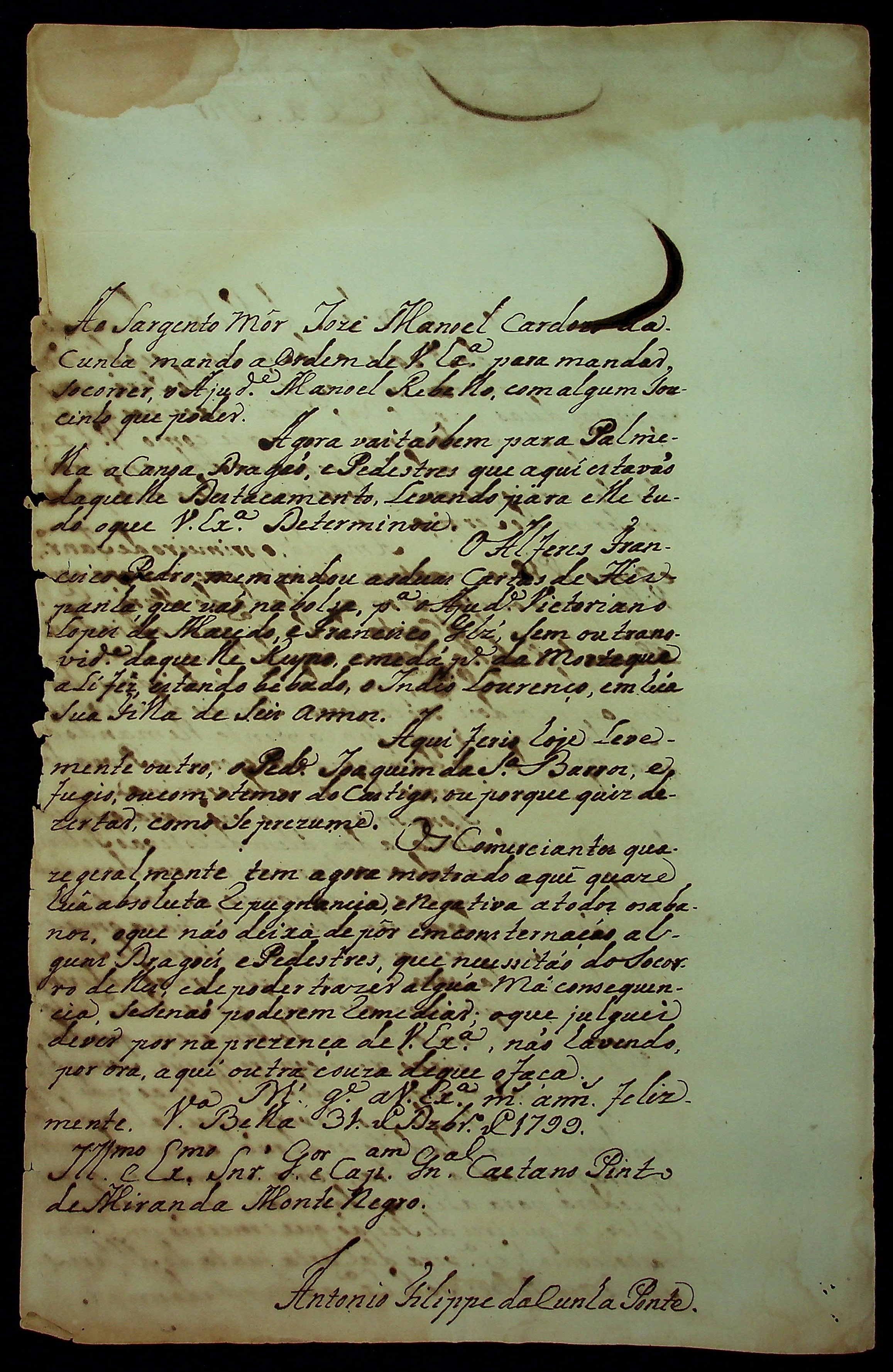 CARTA do [Tenente-Coronel] Antônio Felipe da Cunha Ponte ao [Governador e Capitão-General da Capitania de Mato Grosso] Caetano Pinto de Miranda e Montenegro.