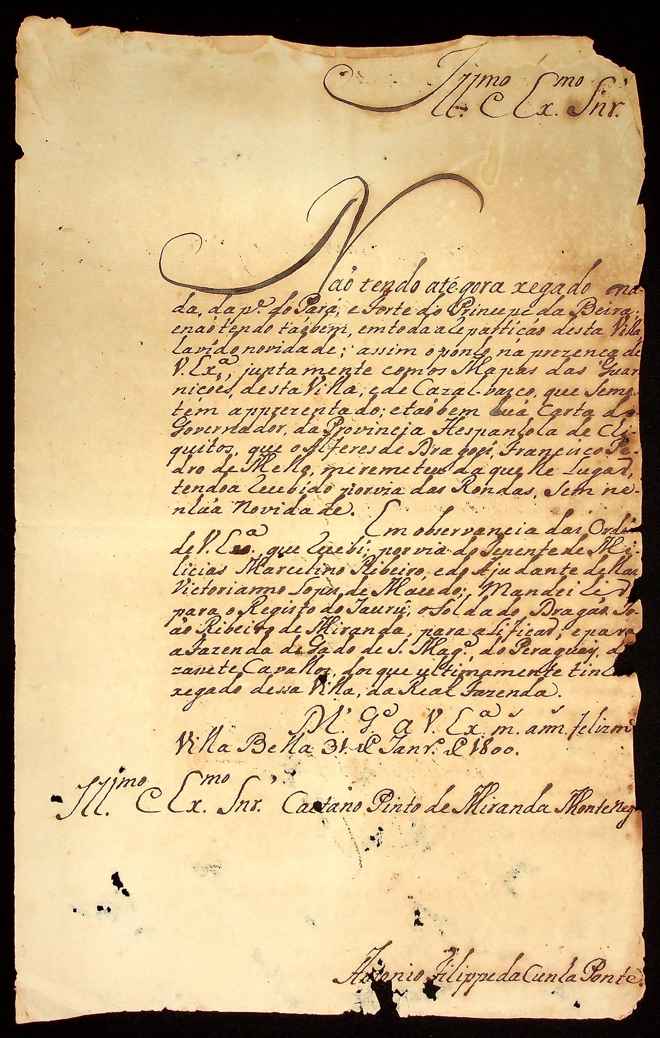 CARTA do [Coronel] Antônio Felipe da Cunha Ponte ao [Governador e Capitão-General da Capitania de Mato Grosso] Caetano Pinto de Miranda e Montenegro.