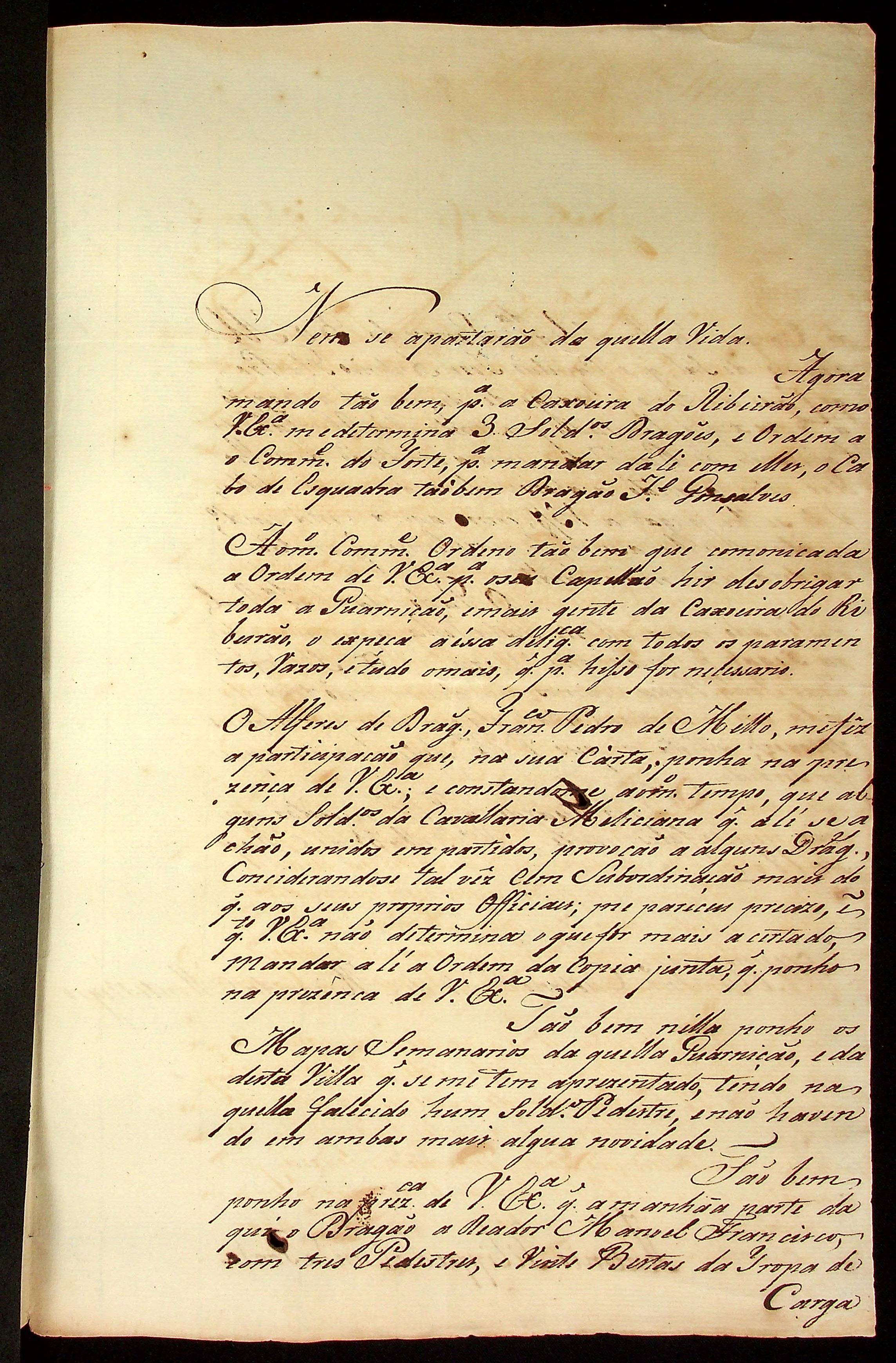 CARTA do [Coronel] Antônio Felipe da Cunha Ponte ao [Governador e Capitão-General da Capitania de Mato Grosso] Caetano Pinto de Miranda e Montenegro.