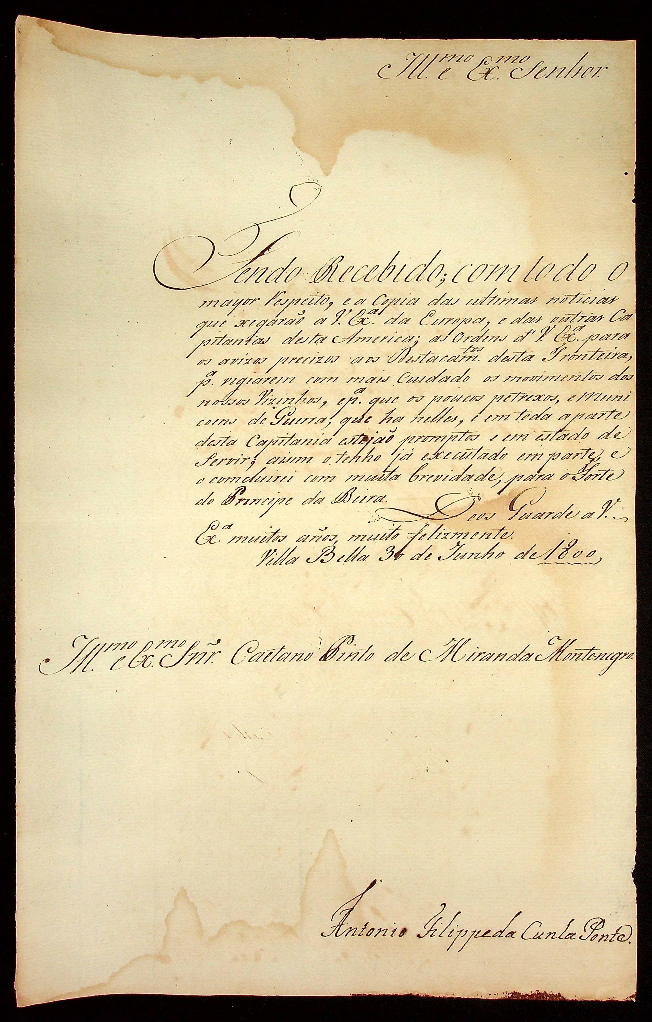 CARTA do [Coronel] Antônio Felipe da Cunha Ponte ao [Governador e Capitão-General da Capitania de Mato Grosso] Caetano Pinto de Miranda e Montenegro.