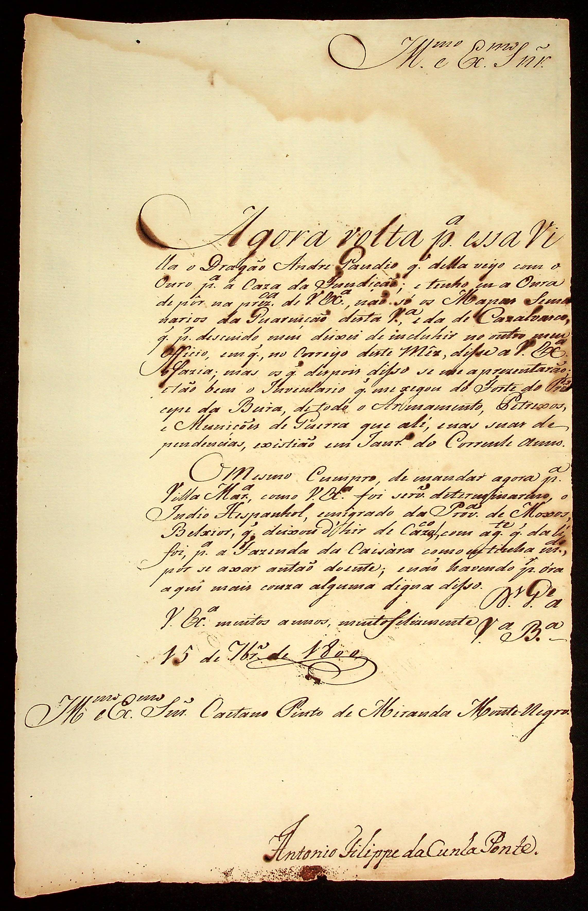 CARTA do [Coronel] Antônio Felipe da Cunha Ponte ao [Governador e Capitão-General da Capitania de Mato Grosso] Caetano Pinto de Miranda e Montenegro.