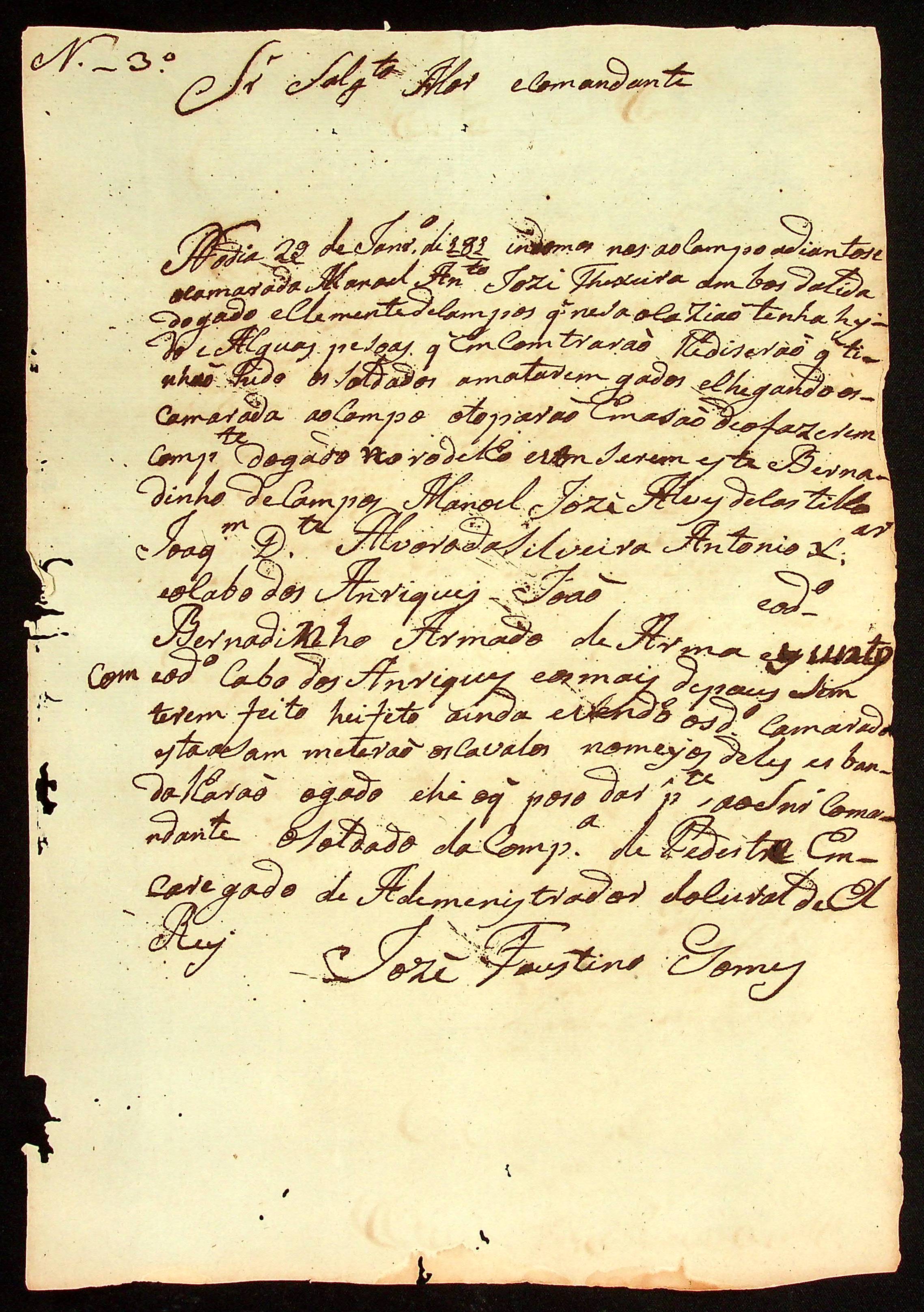 CARTA do Soldado da Companhia de Pedestre encomendado do administrador do curral de El´Rei José Faustino Gomes ao Sargento-mor e Comandante […].