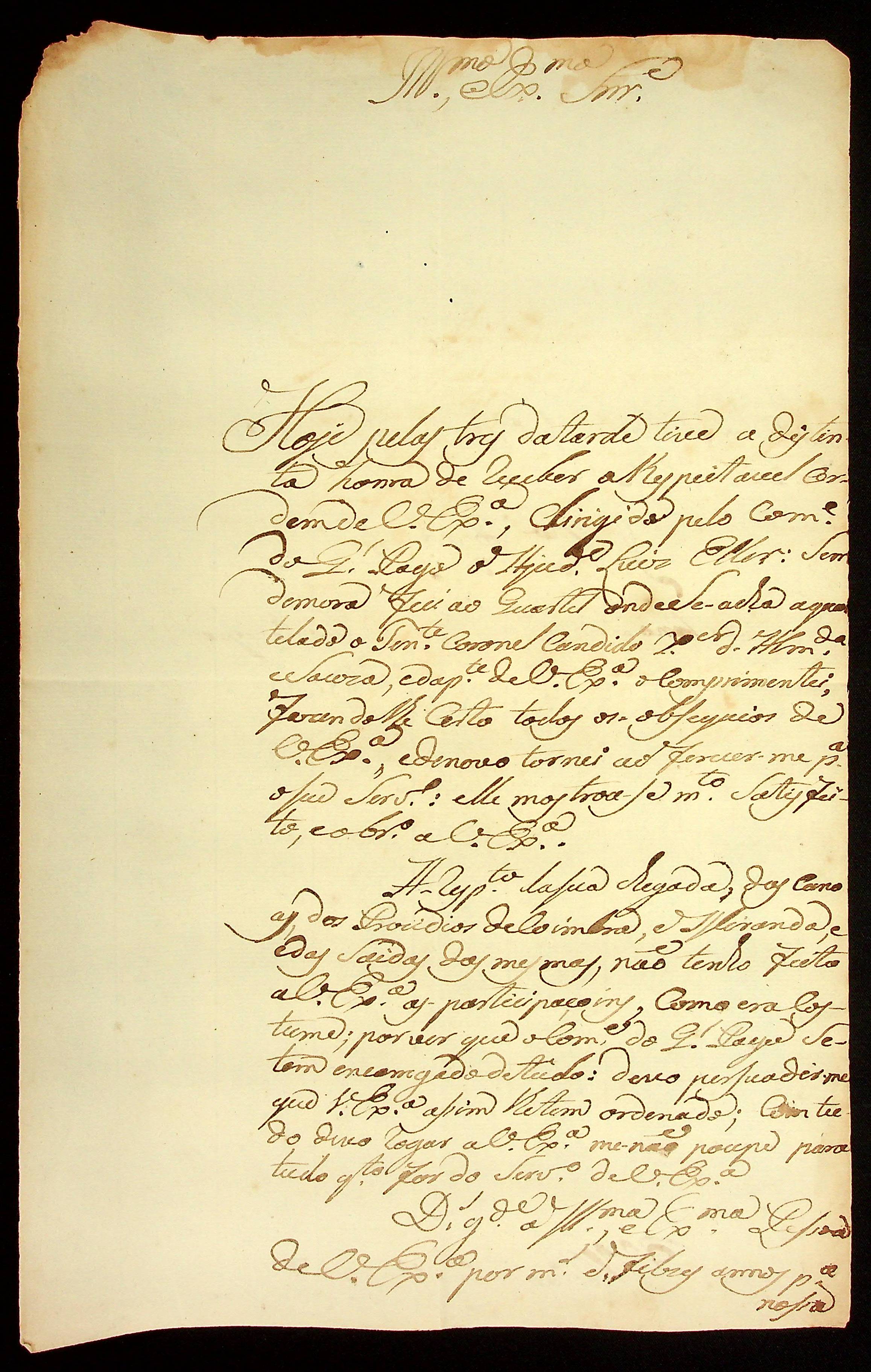 CARTA do Mestre de Campo e Comandante José Paes Falcão das Neves ao [Governador e Capitão-General da Capitania de Mato Grosso] Caetano Pinto de Miranda e Montenegro.