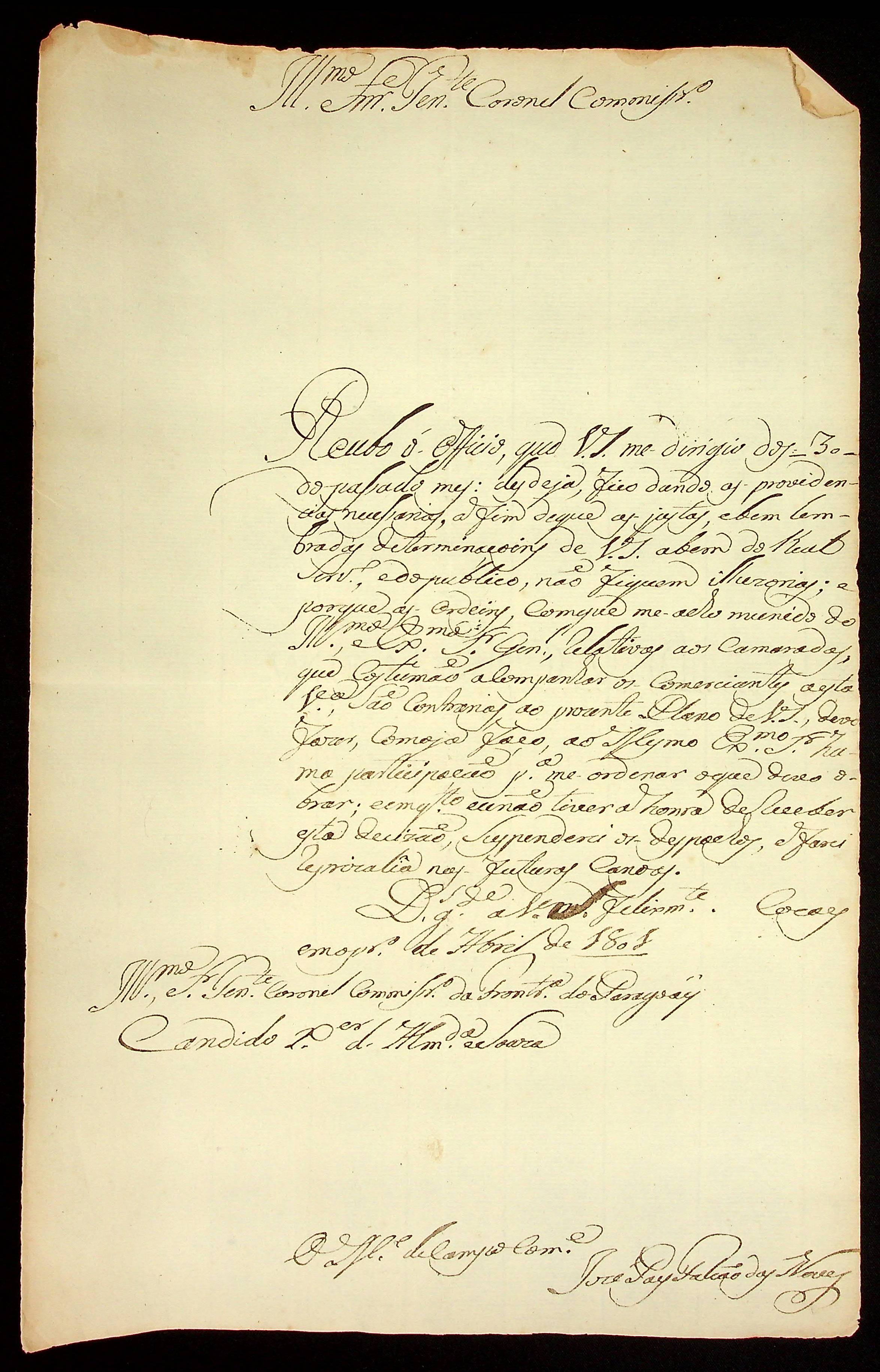 CARTA do Mestre de Campo e Comandante José Paes Falcão das Neves ao Tenente-Coronel Comissário Candido Xavier de Almeida e Souza.