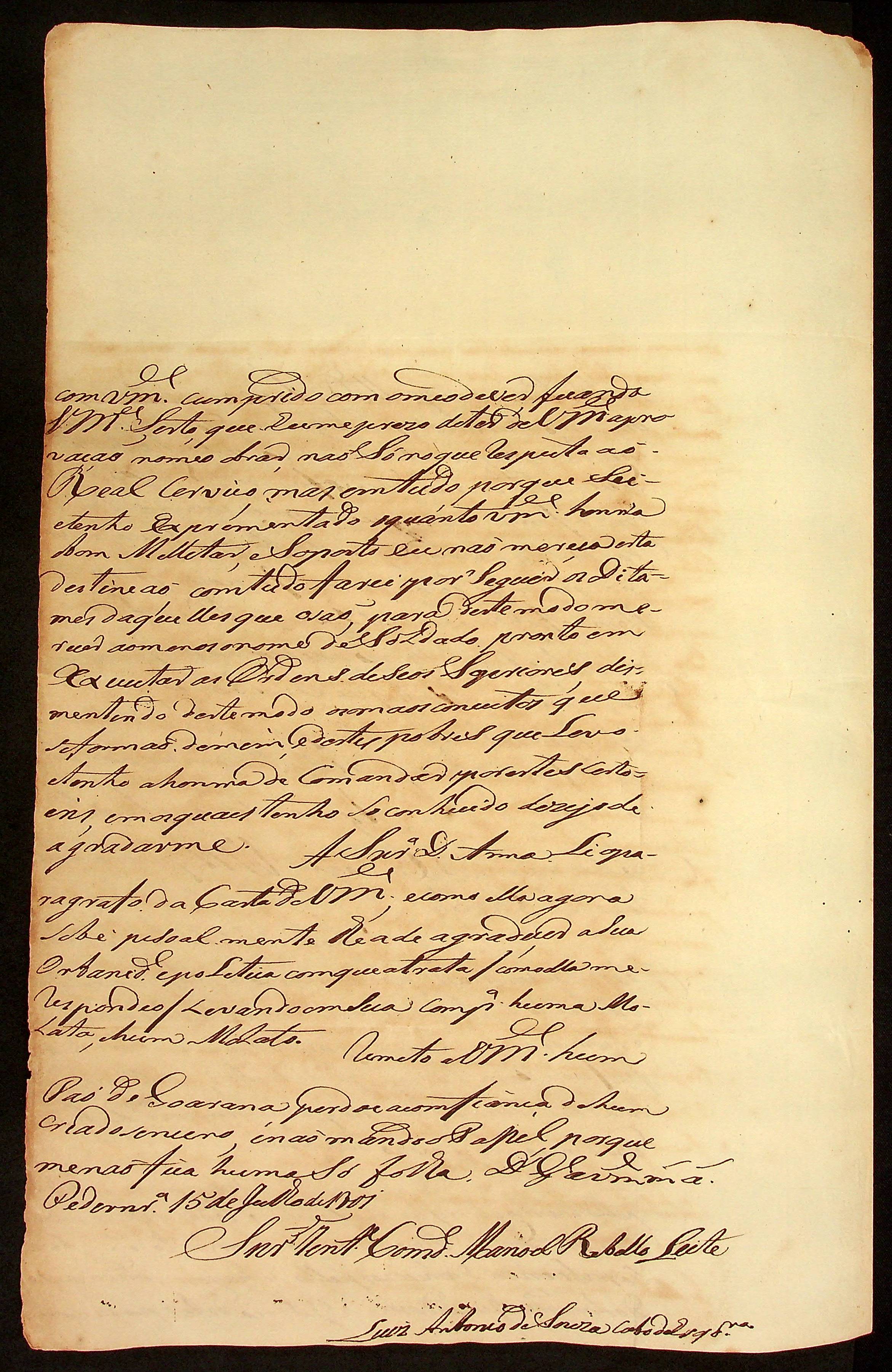 CARTA do Cabo de Esquadra Luís Antônio de Souza ao [Tenente Comandante] Manoel [Rabelo] Leite.
