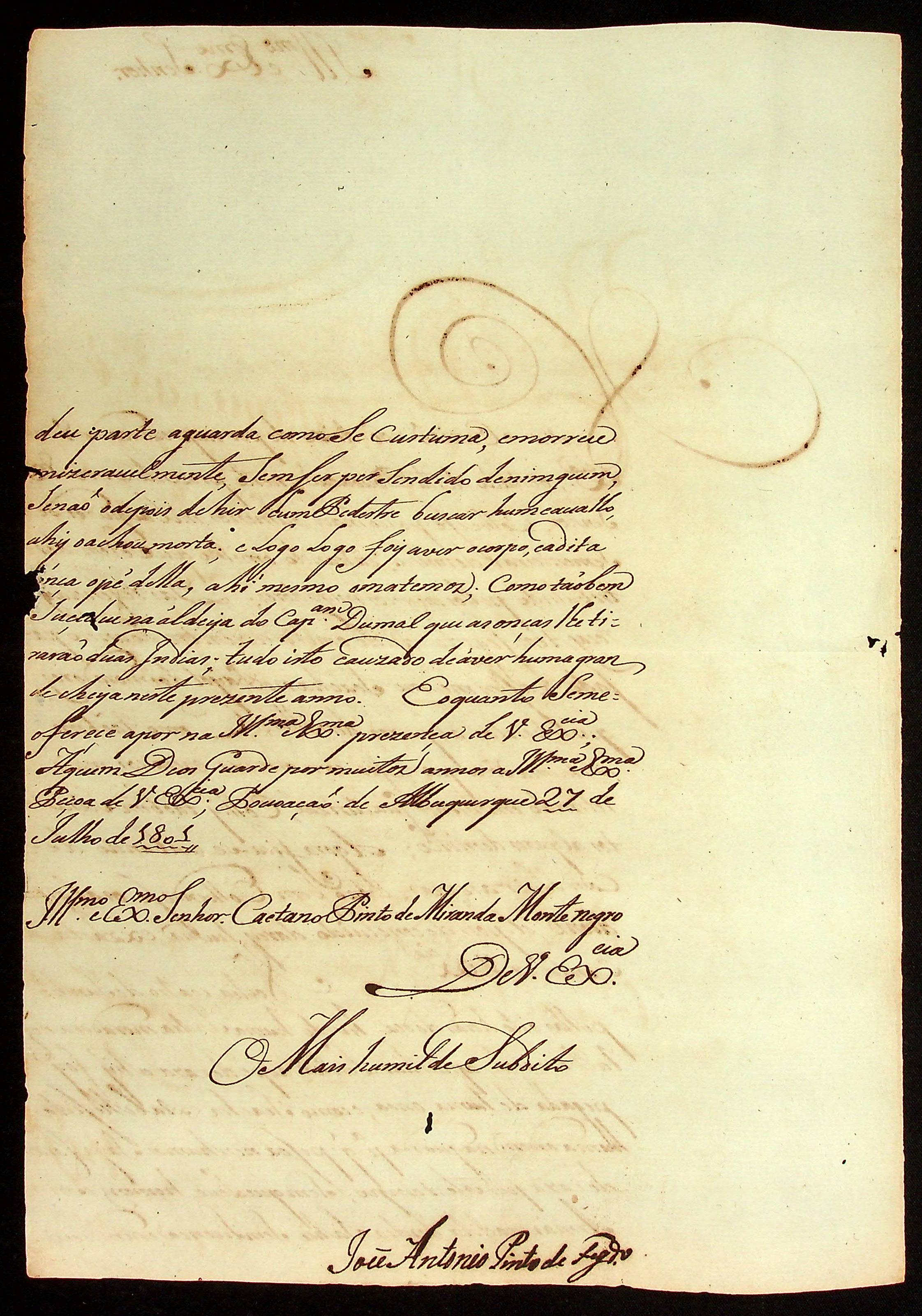 CARTA do [Comandante da Povoação de Albuquerque] José Antônio Pinto de Figueiredo ao [Governador e Capitão-General da Capitania de Mato Grosso] Caetano Pinto de Miranda e Montenegro.