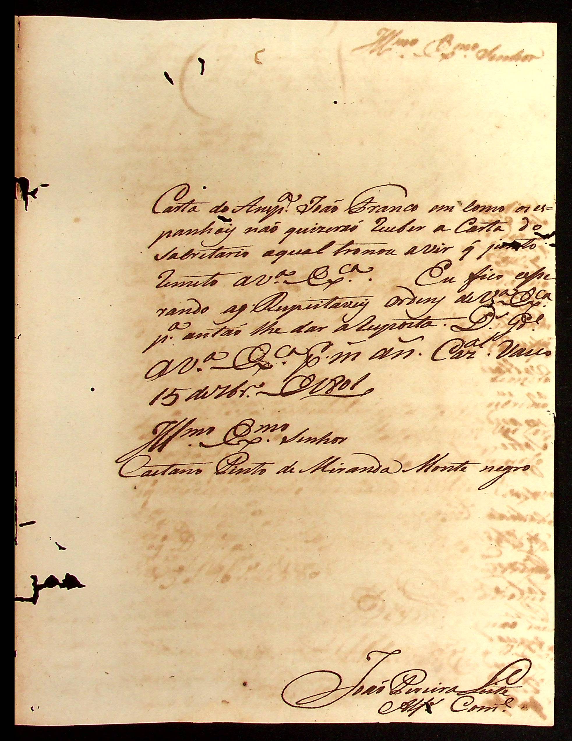 CARTA do [Alferes] João Pereira Leite ao [Governador e Capitão-General da Capitania de Mato Grosso] Caetano Pinto de Miranda e Montenegro.