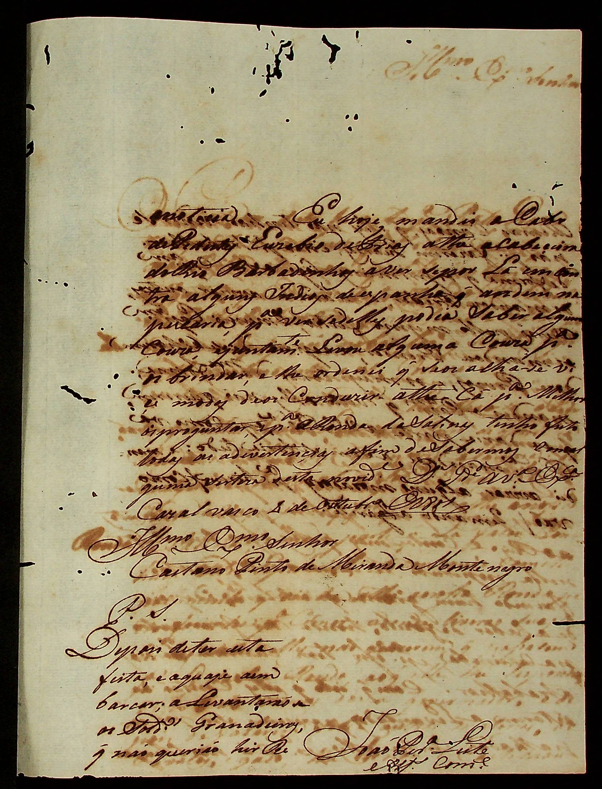 CARTA do [Alferes] João Pereira Leite ao [Governador e Capitão-General da Capitania de Mato Grosso] Caetano Pinto de Miranda e Montenegro.
