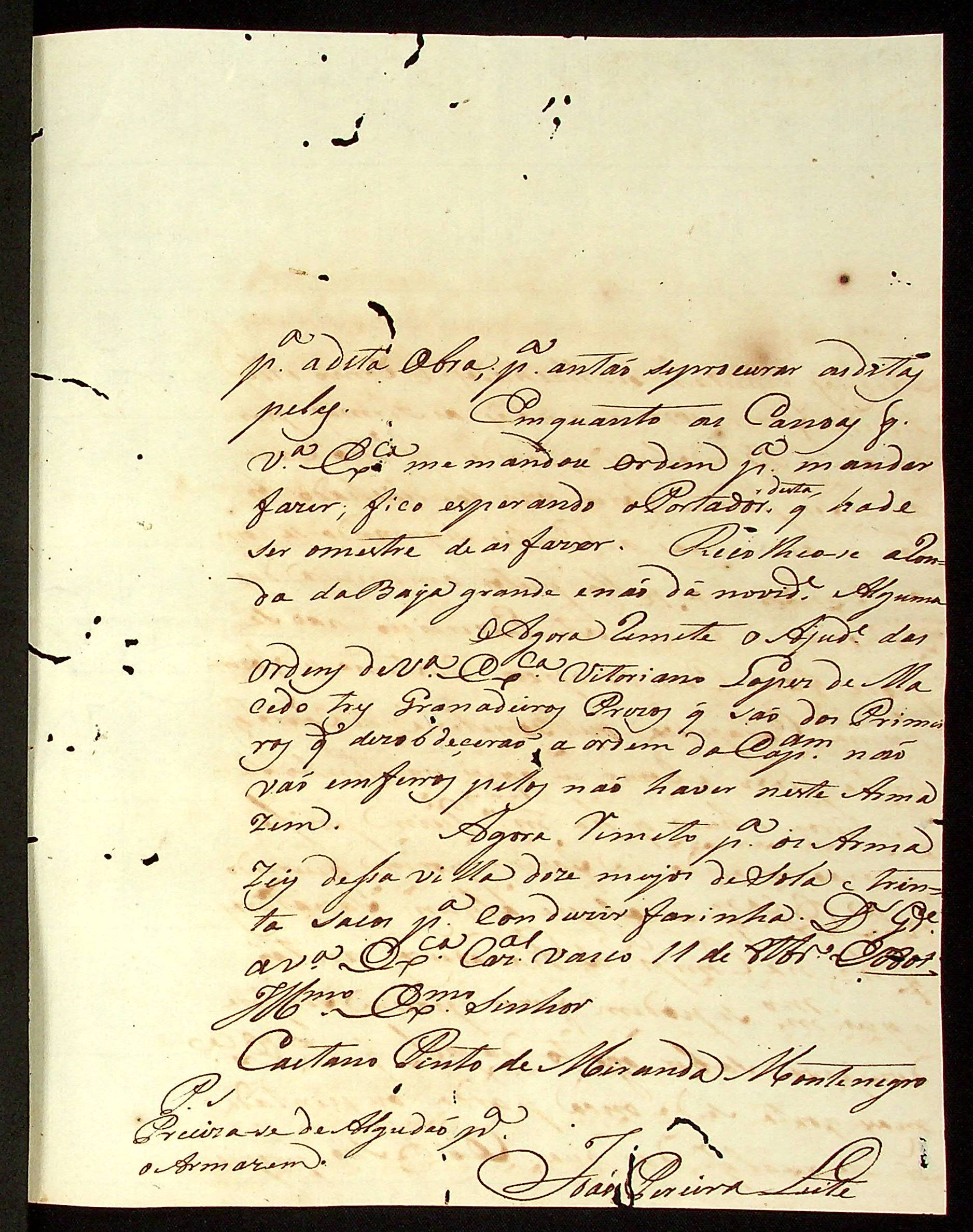 CARTA do [Alferes] João Pereira Leite ao [Governador e Capitão-General da Capitania de Mato Grosso] Caetano Pinto de Miranda e Montenegro.