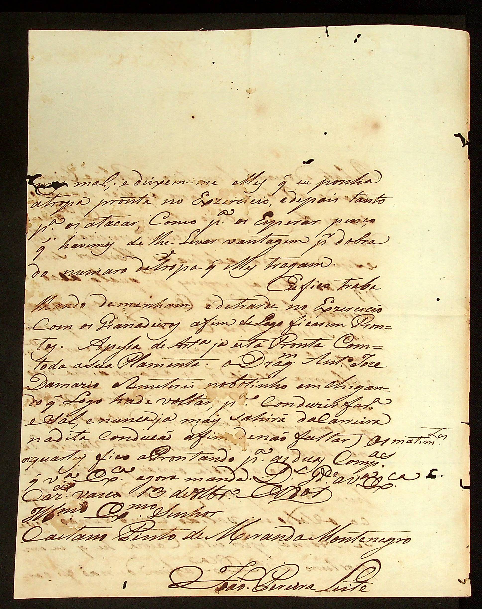 CARTA do [Alferes] João Pereira Leite ao [Governador e Capitão-General da Capitania de Mato Grosso] Caetano Pinto de Miranda e Montenegro.
