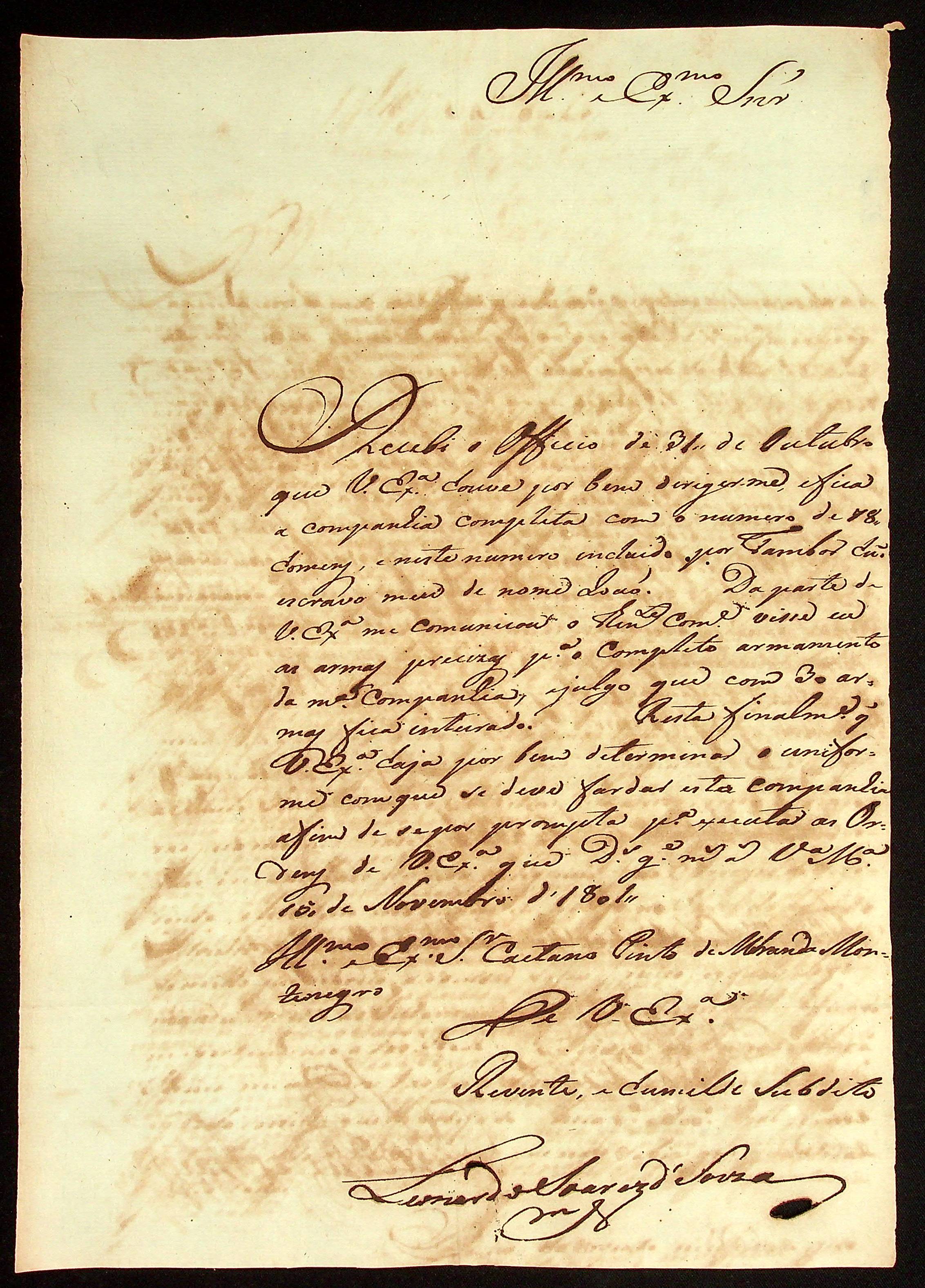 CARTA do [Capitão da Companhia de Infantaria de Milícias] Leonardo Soares de Souza ao [Governador e Capitão-General da Capitania de Mato Grosso] Caetano Pinto de Miranda e Montenegro.
