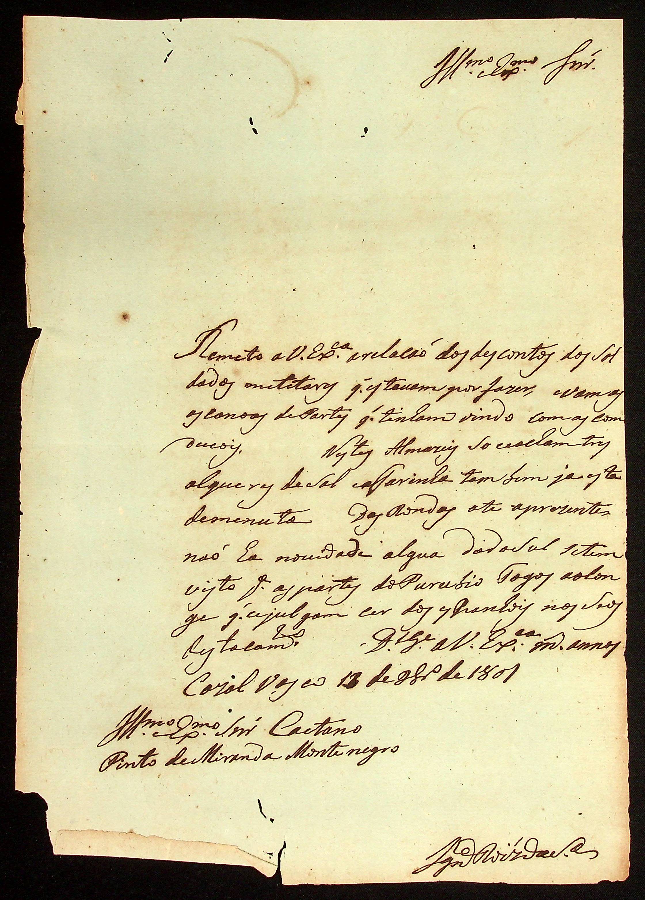 CARTA do [Tenente-Coronel] Inácio Rodrigues da Silva ao [Governador e Capitão-General da capitania de Mato Grosso] Caetano Pinto de Miranda e Montenegro.