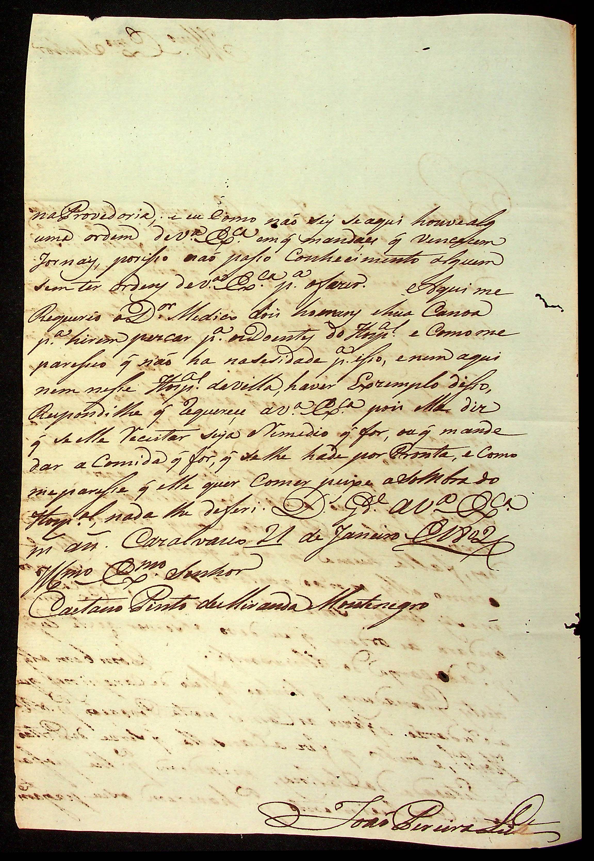 CARTA do [Alferes e Comandante] João Pereira Leite ao [Governador e Capitão-General da Capitania de Mato Grosso] Caetano Pinto de Miranda Montenegro.
