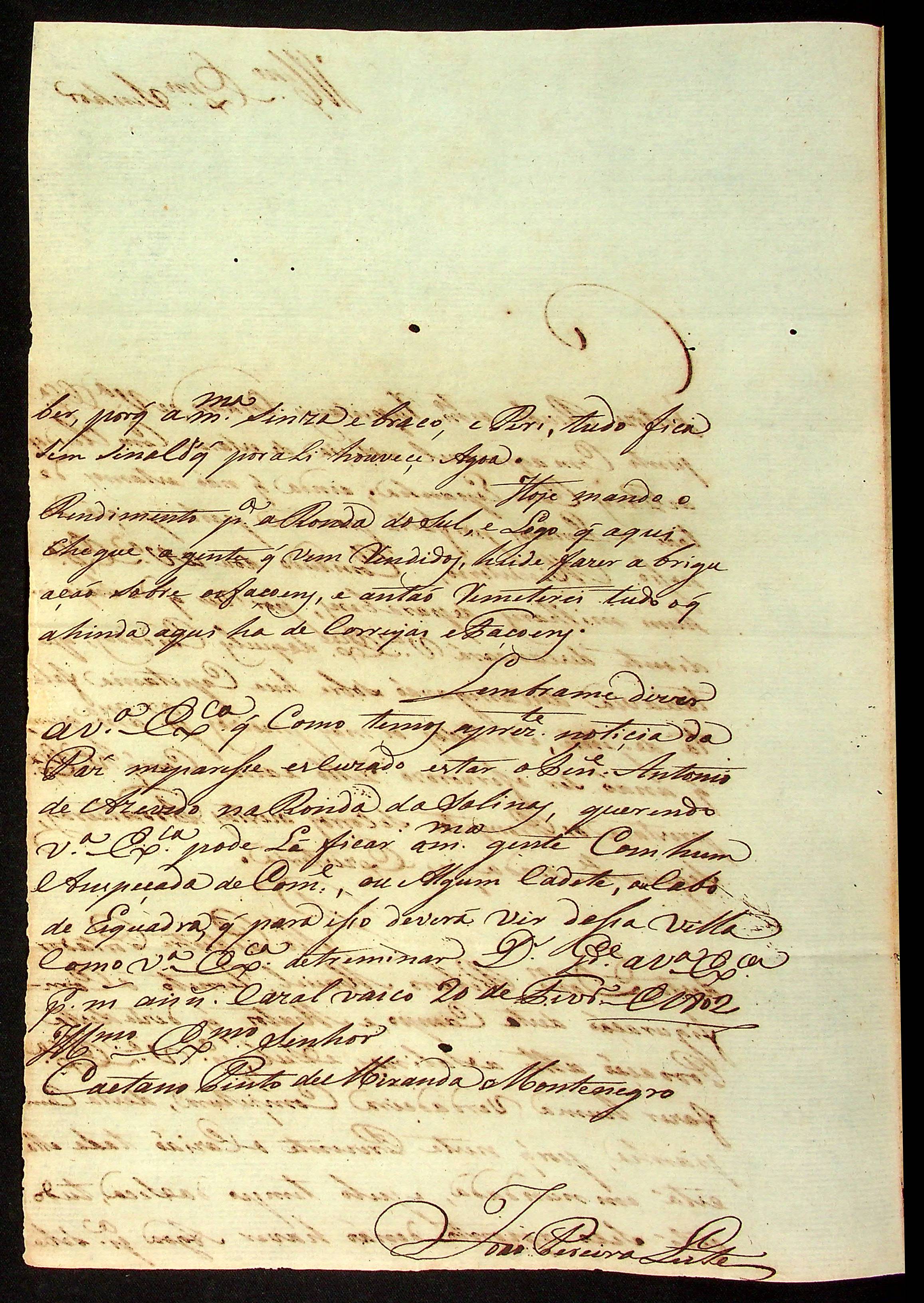 CARTA do [Alferes e Comandante] João Pereira Leite ao [Governador e Capitão-General da Capitania de Mato Grosso] Caetano Pinto de Miranda Montenegro.