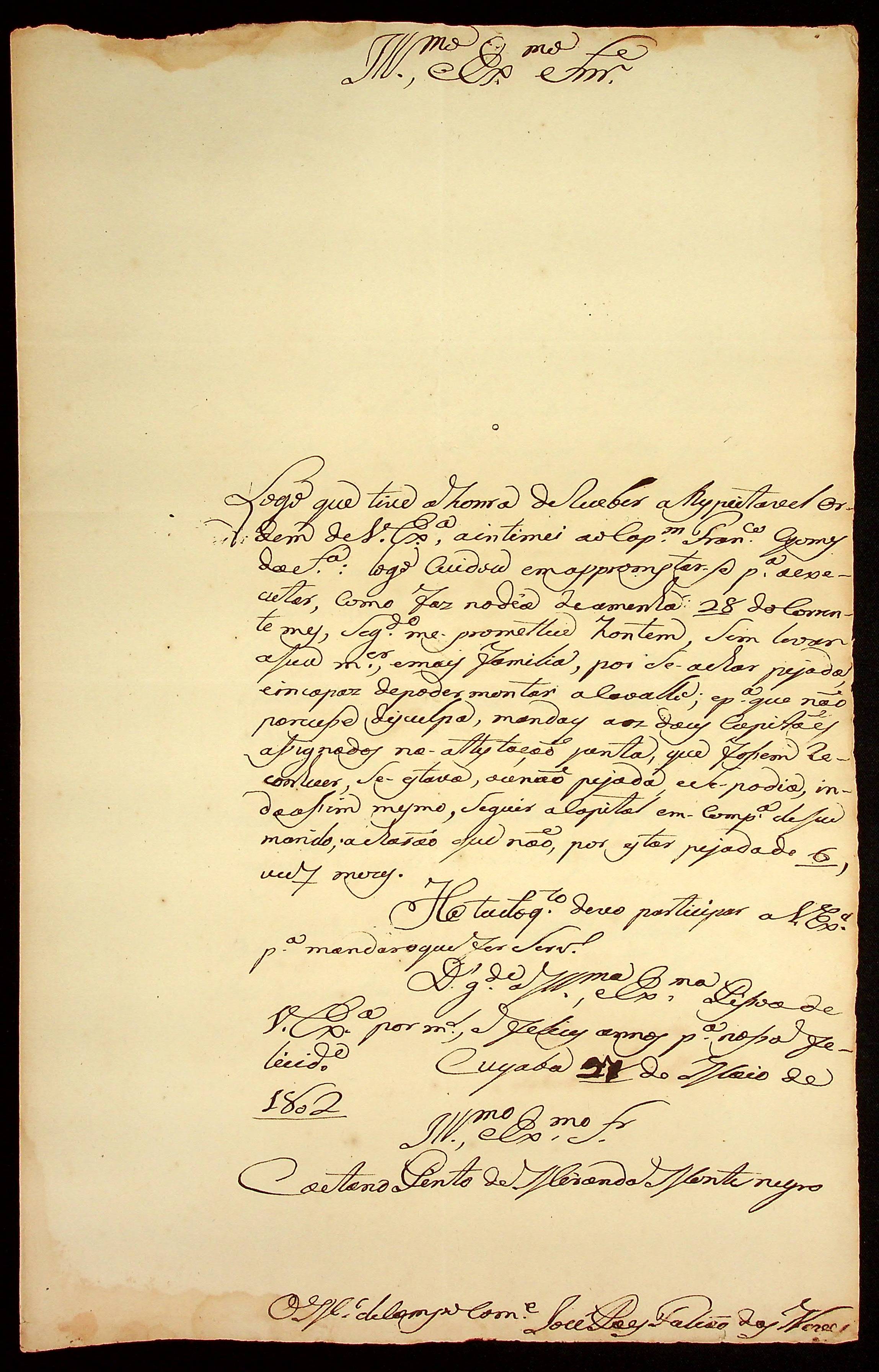 CARTA do Mestre de Campo e Comandante José Paes Falcão das Neves ao [Governador e Capitão-General da Capitania de Mato Grosso] Caetano Pinto de Miranda Montenegro.