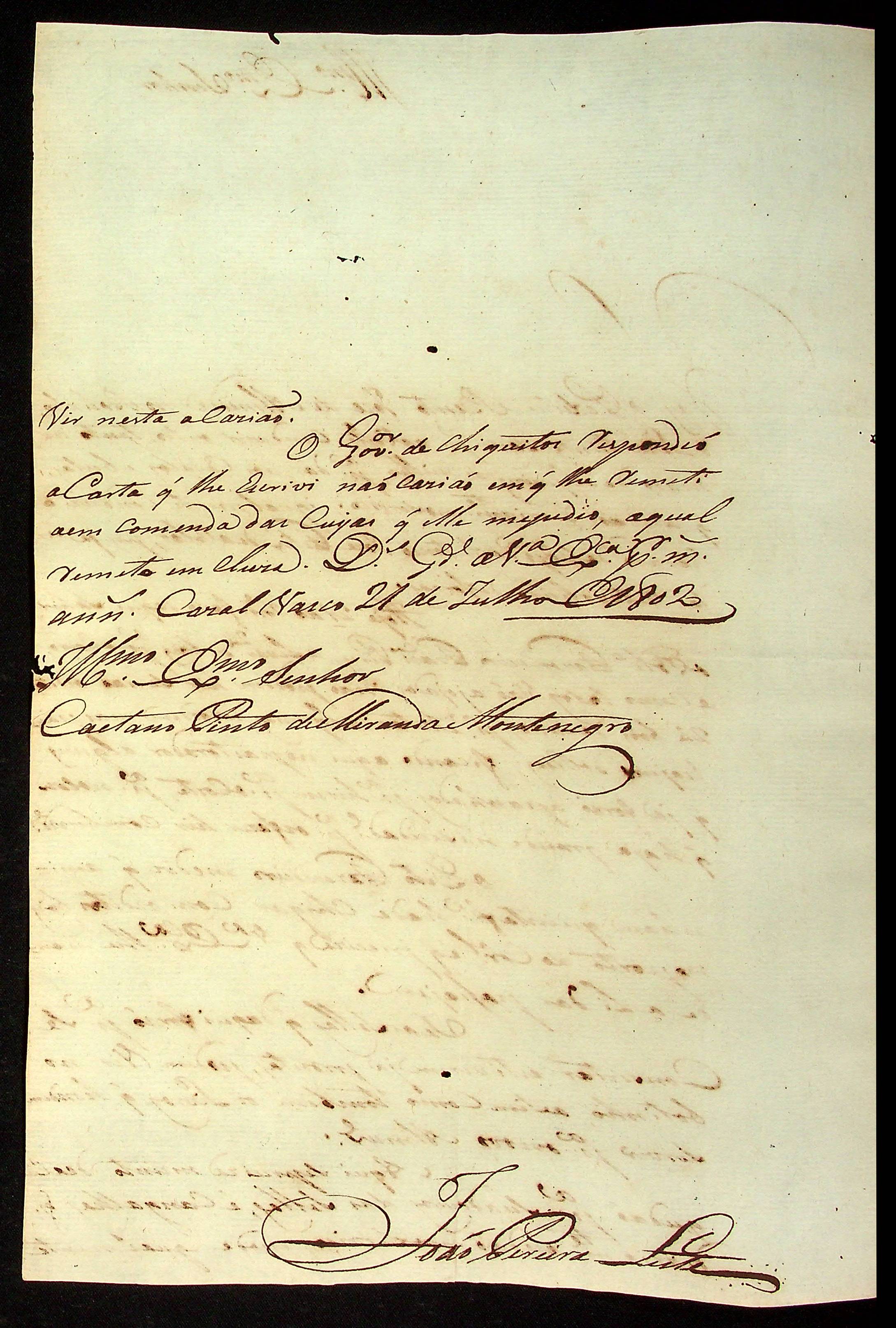 CARTA do [Alferes e Comandante] João Pereira Leite ao [Governador e Capitão-General da Capitania de Mato Grosso] Caetano Pinto de Miranda Montenegro.