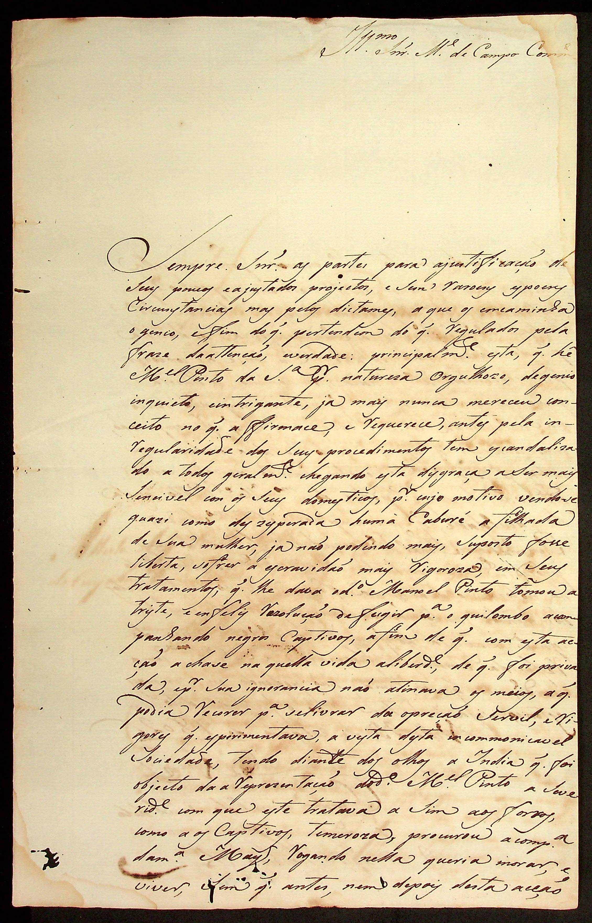 CARTA do Alferes José Monteiro ao Mestre de Campo e Comandante [José Paes Falcão das Neves].