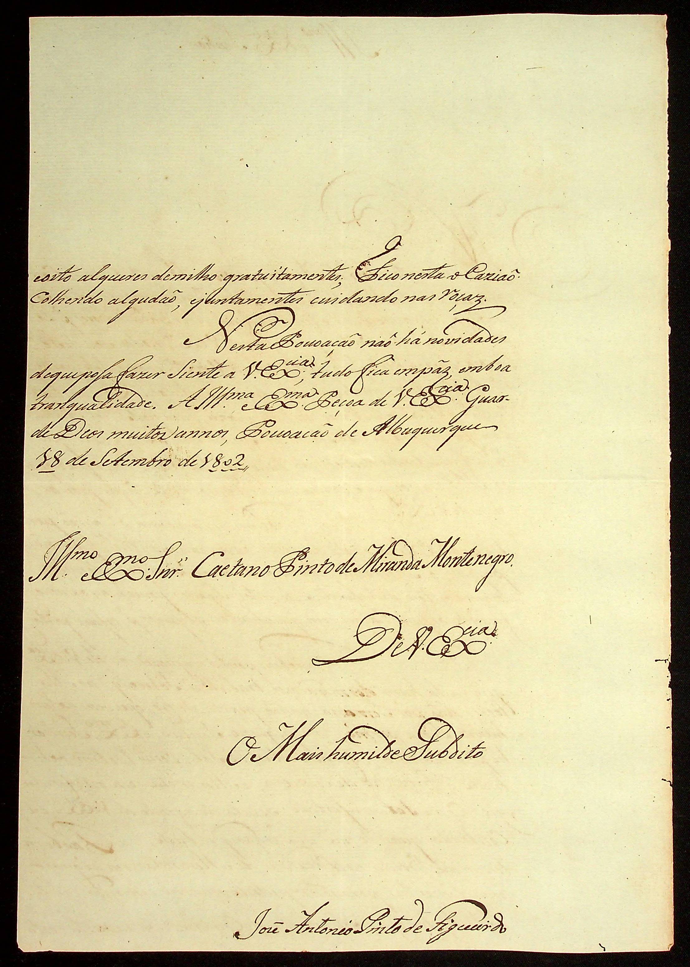 CARTA do [Comandante] José Antônio Pinto de Figueiredo ao [Governador e Capitão-General da Capitania de Mato Grosso] Caetano Pinto de Miranda Montenegro.