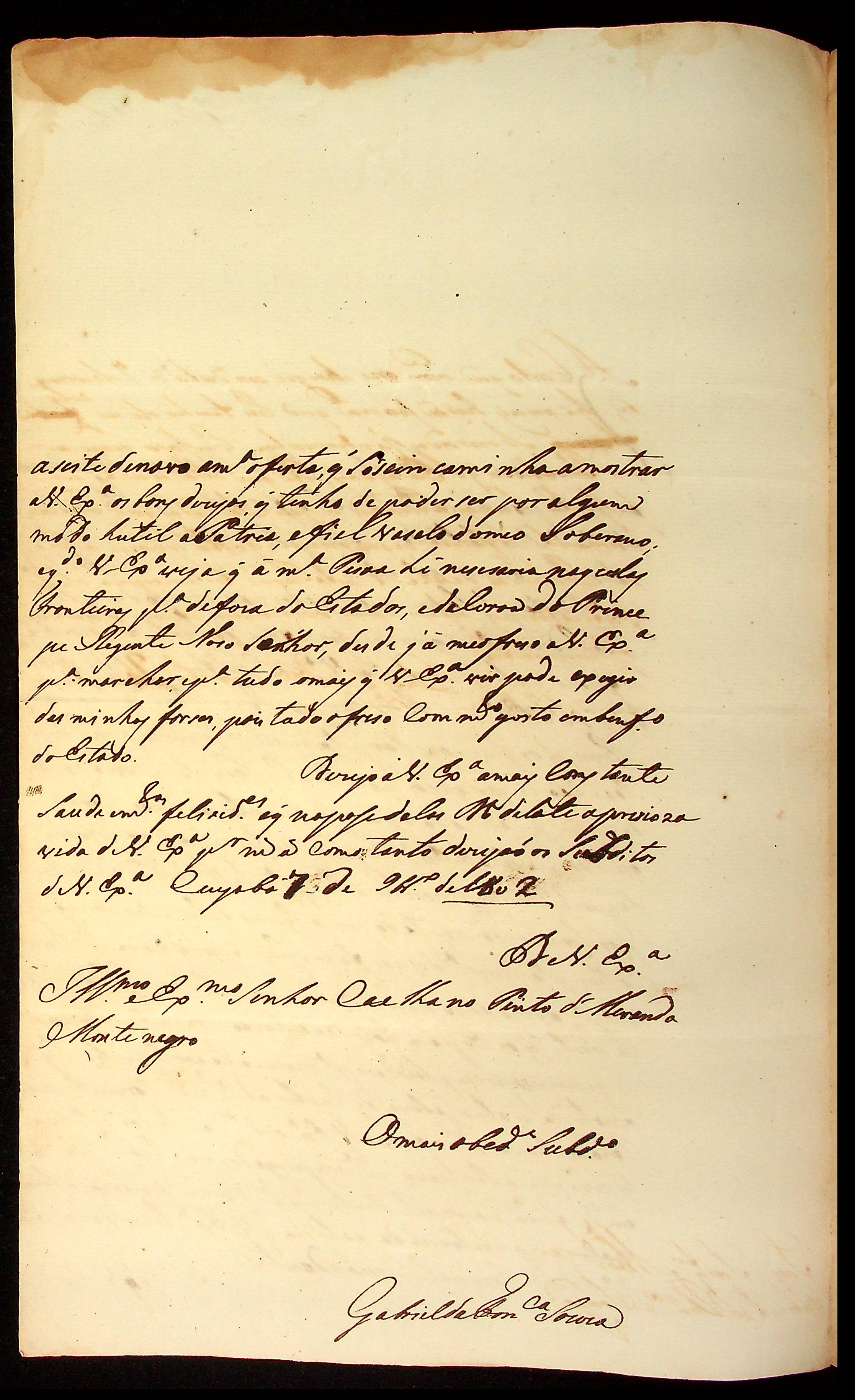 CARTA do [Sargento-mor] Gabriel da Fonseca Souza ao [Governador e Capitão-General da Capitania de Mato Grosso] Caetano Pinto de Miranda Montenegro.