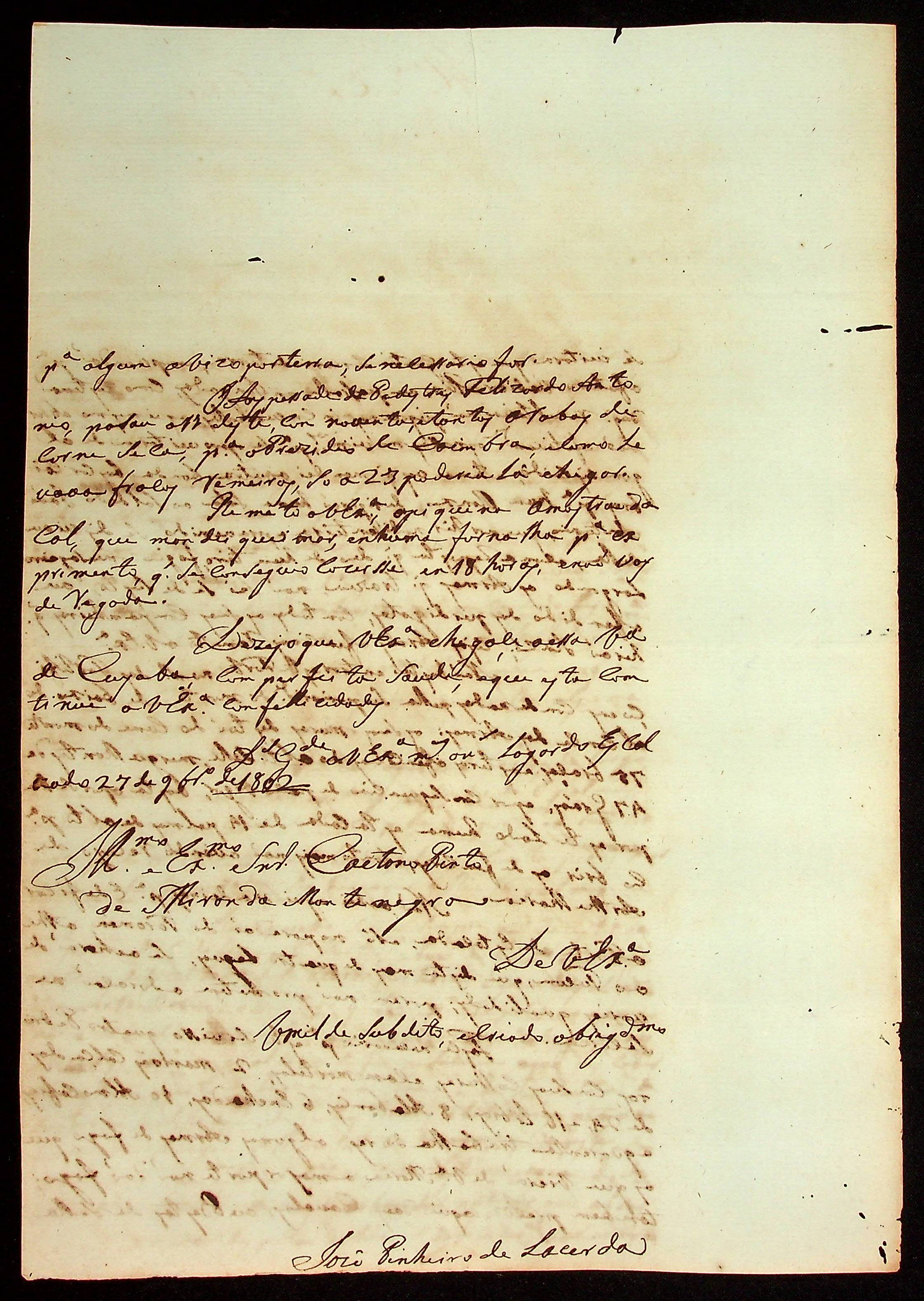 CARTA de José Pinheiro de Lacerda ao [Governador e Capitão-General da Capitania de Mato Grosso] Caetano Pinto de Miranda Montenegro.