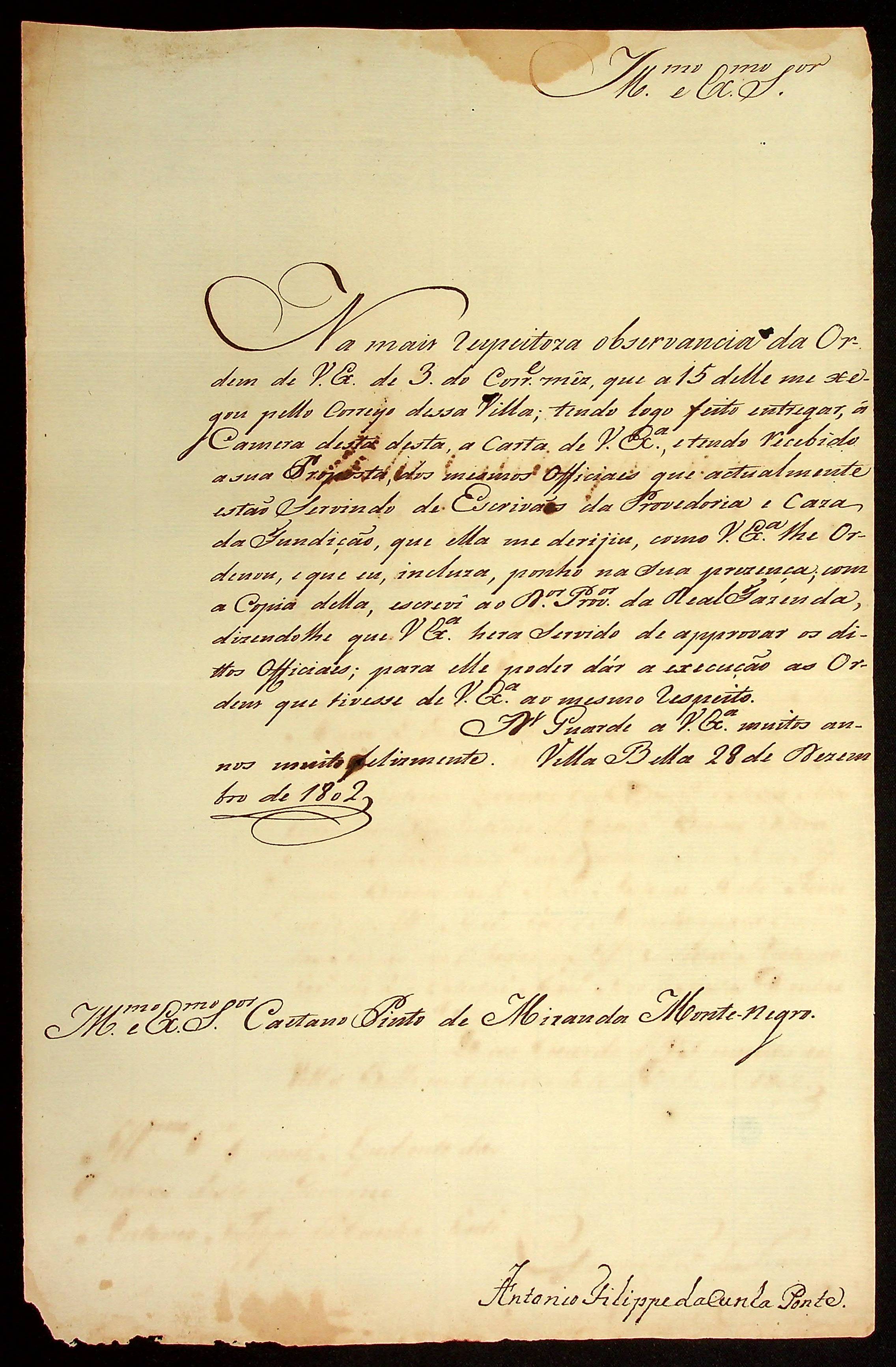 CARTA do [Coronel Ajudante de Ordens] Antônio Felipe da Cunha Ponte ao [Governador e Capitão-General da Capitania de Mato Grosso] Caetano Pinto de Miranda Montenegro.
