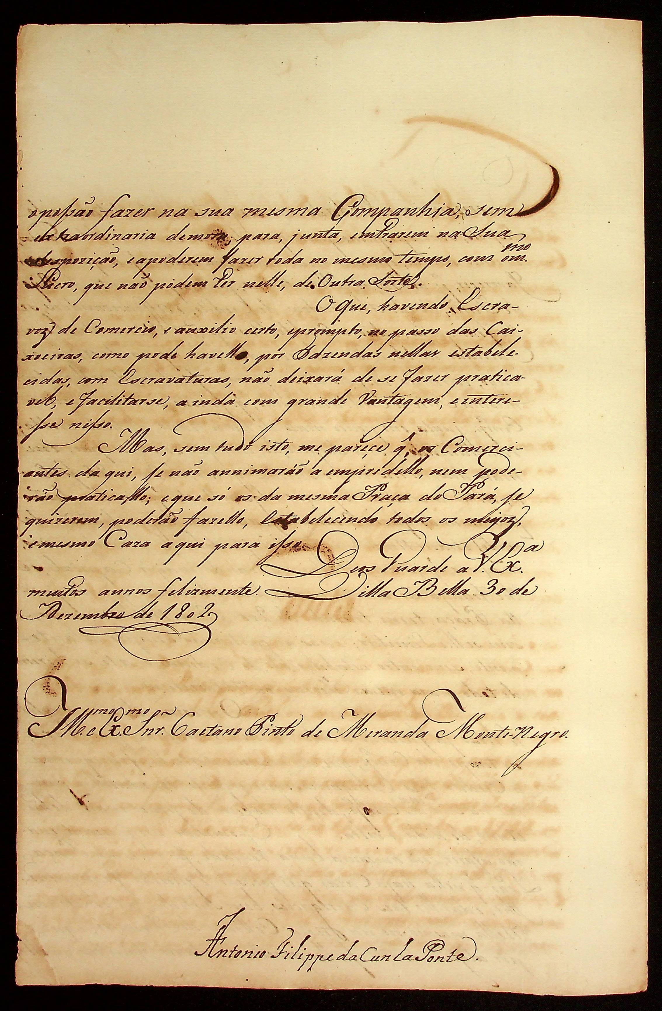 CARTA do [Coronel Ajudante de Ordens] Antônio Felipe da Cunha Ponte ao [Governador e Capitão-General da Capitania de Mato Grosso] Caetano Pinto de Miranda Montenegro.