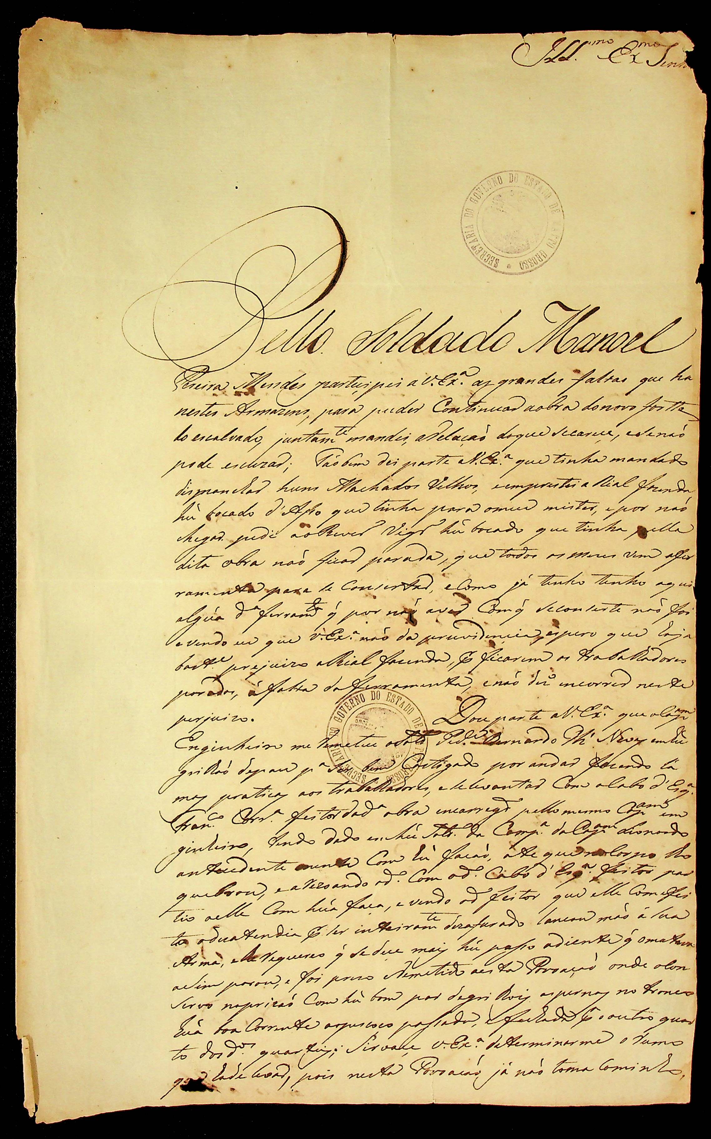 CARTA do [Comandante] Marcelino Ribeiro ao Governador e Capitão-General da Capitania de Mato Grosso Caetano Pinto de Miranda e Montenegro.