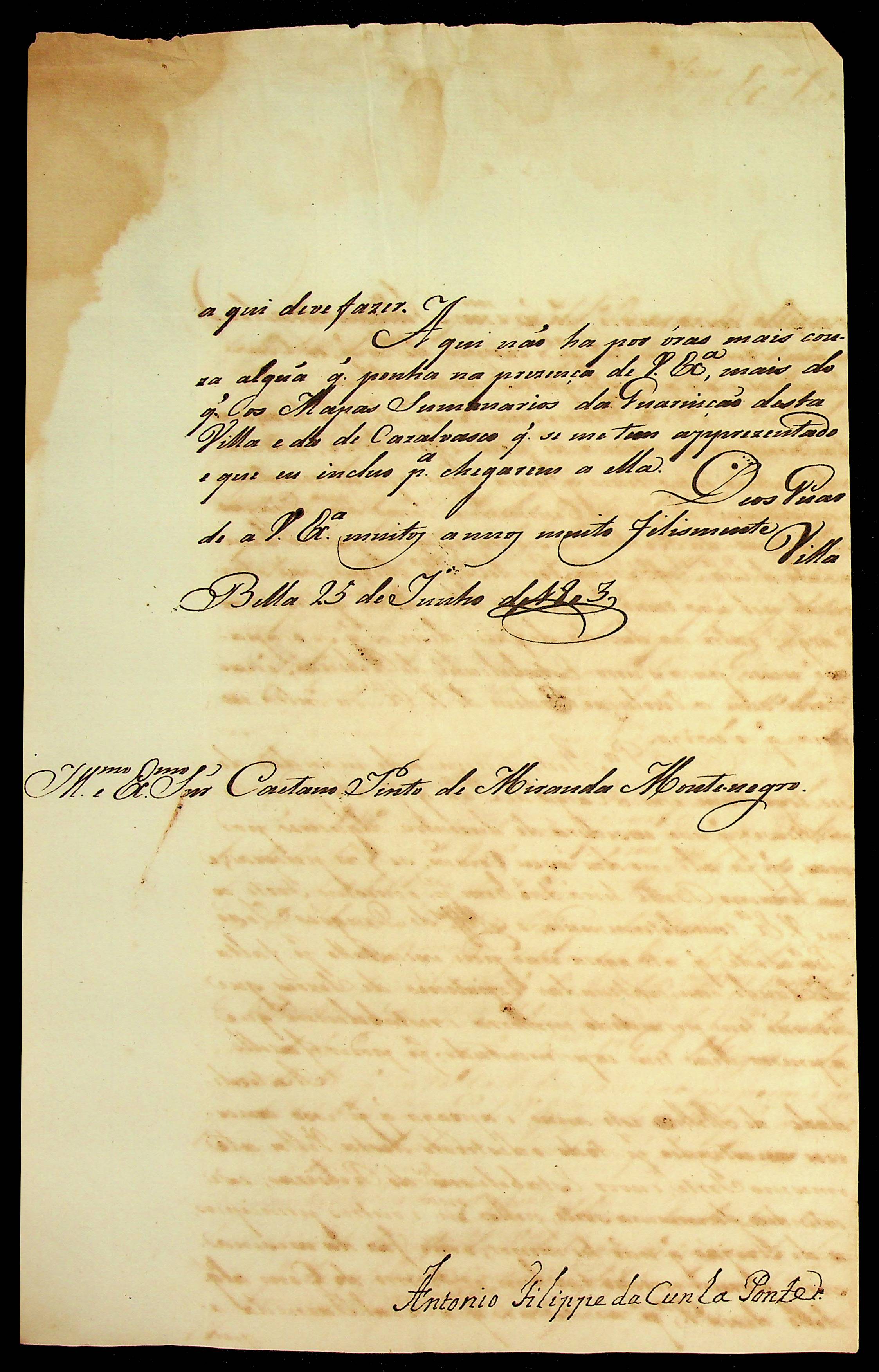 CARTA do [Coronel] Antônio Felipe da Cunha Ponte ao [Governador e Capitão-General da Capitania de Mato Grosso] Caetano Pinto de Miranda e Montenegro.