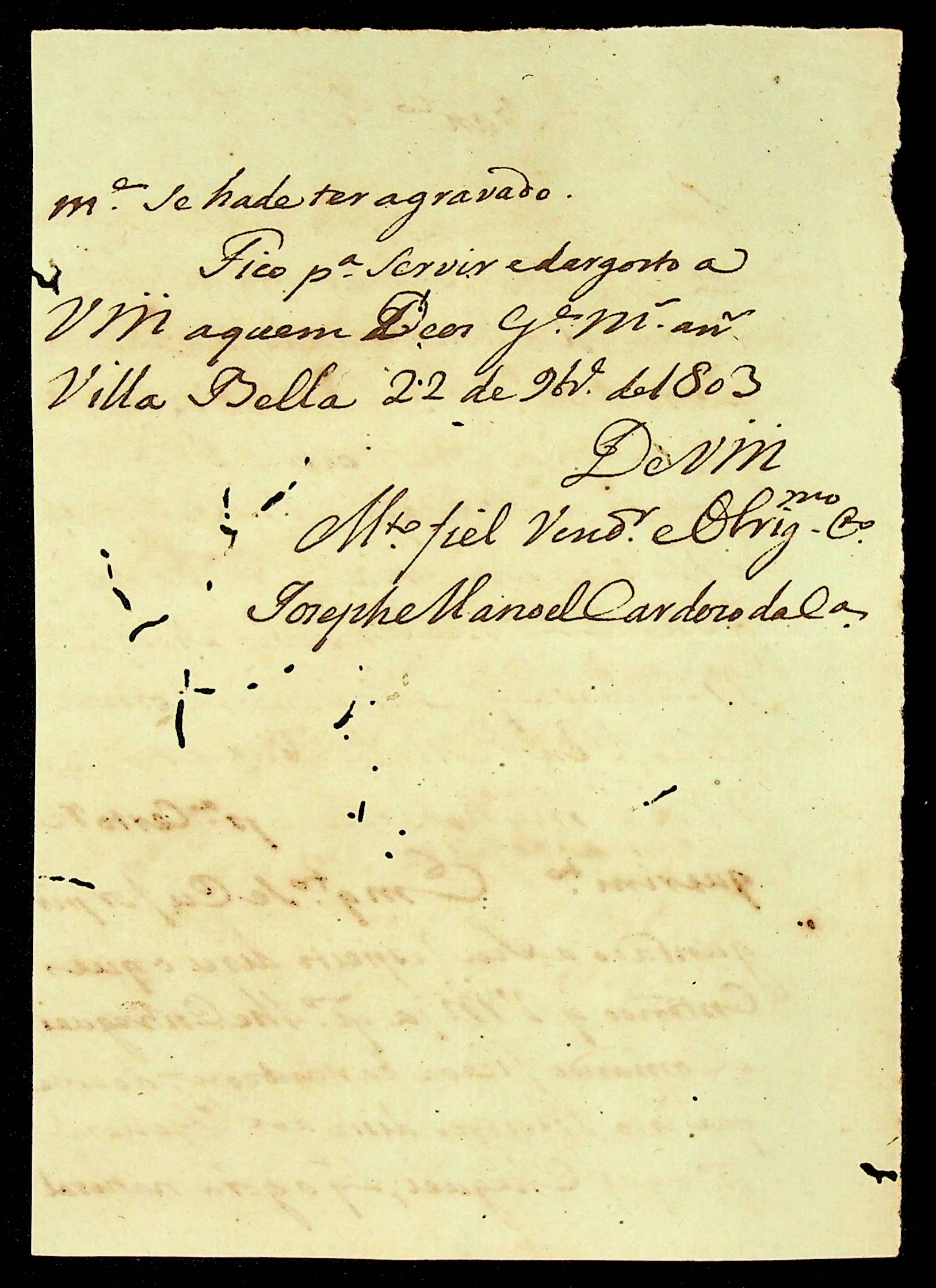 CARTA de José Manoel Cardoso da Cunha ao Tenente Francisco Pedro de Melo.