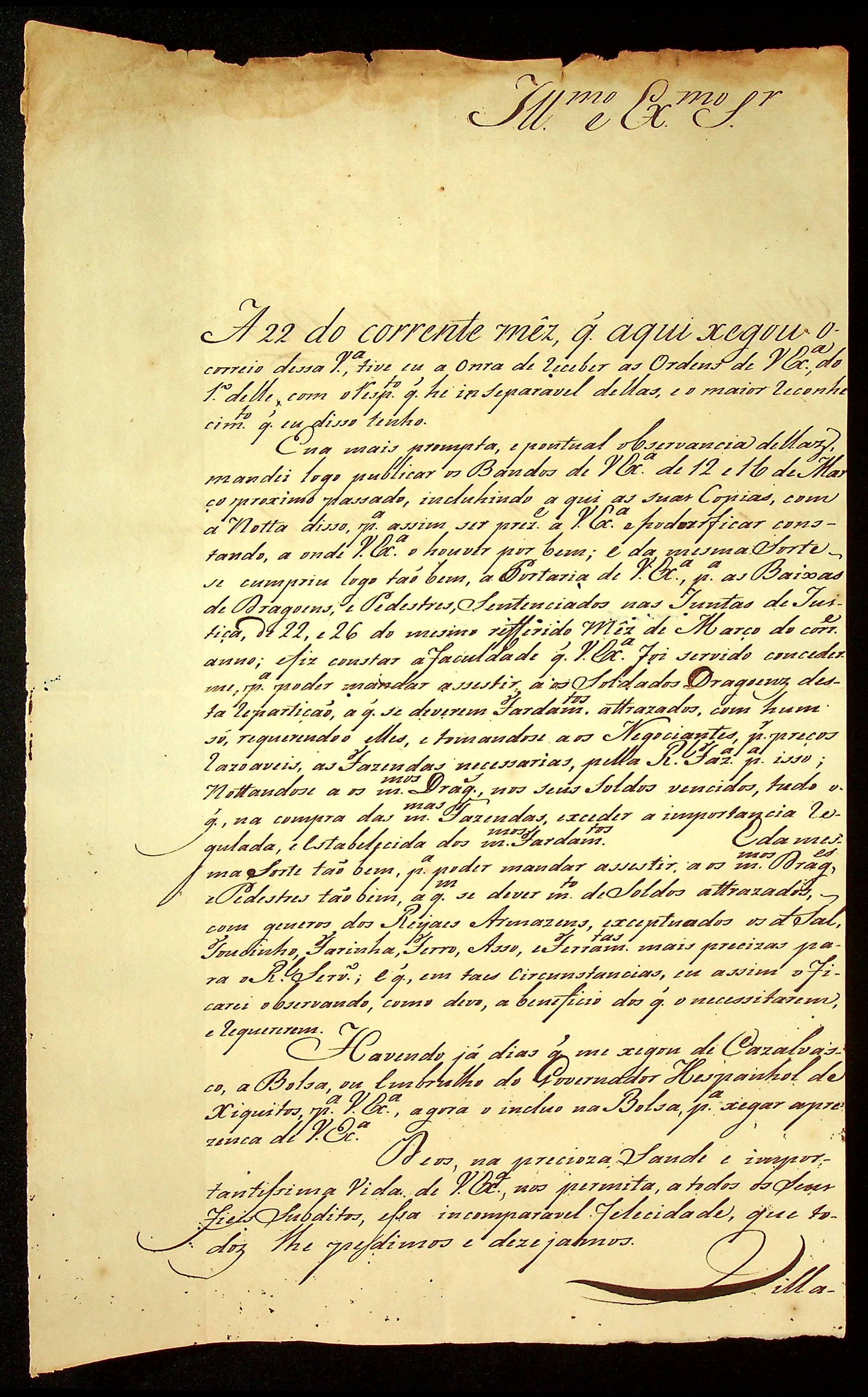 CARTA do [Coronel] Antônio Felipe da Cunha Ponte ao [Governador e Capitão-General da Capitania de Mato Grosso] Manoel Carlos de Abreu e Menezes.