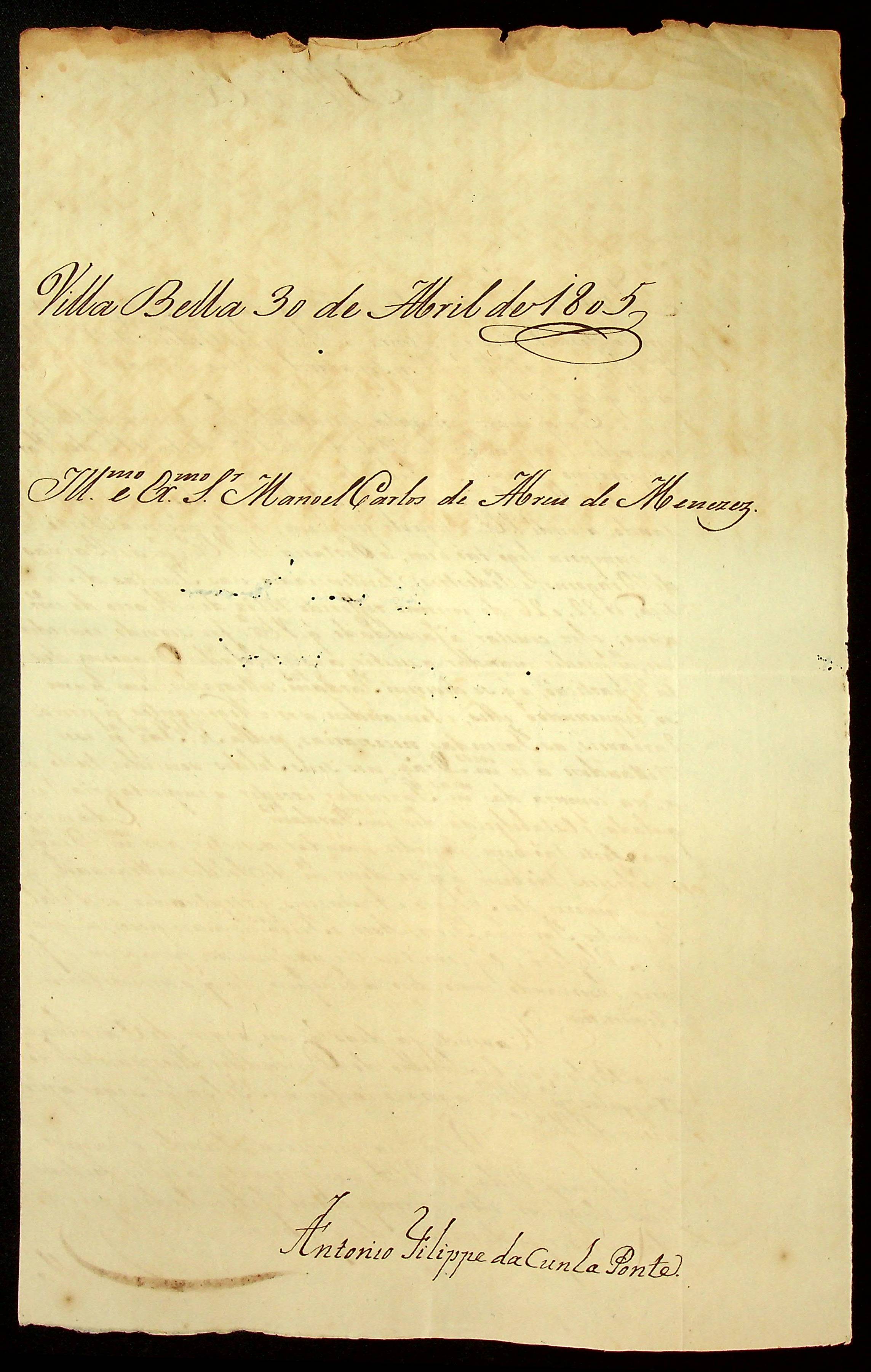 CARTA do [Coronel] Antônio Felipe da Cunha Ponte ao [Governador e Capitão-General da Capitania de Mato Grosso] Manoel Carlos de Abreu e Menezes.